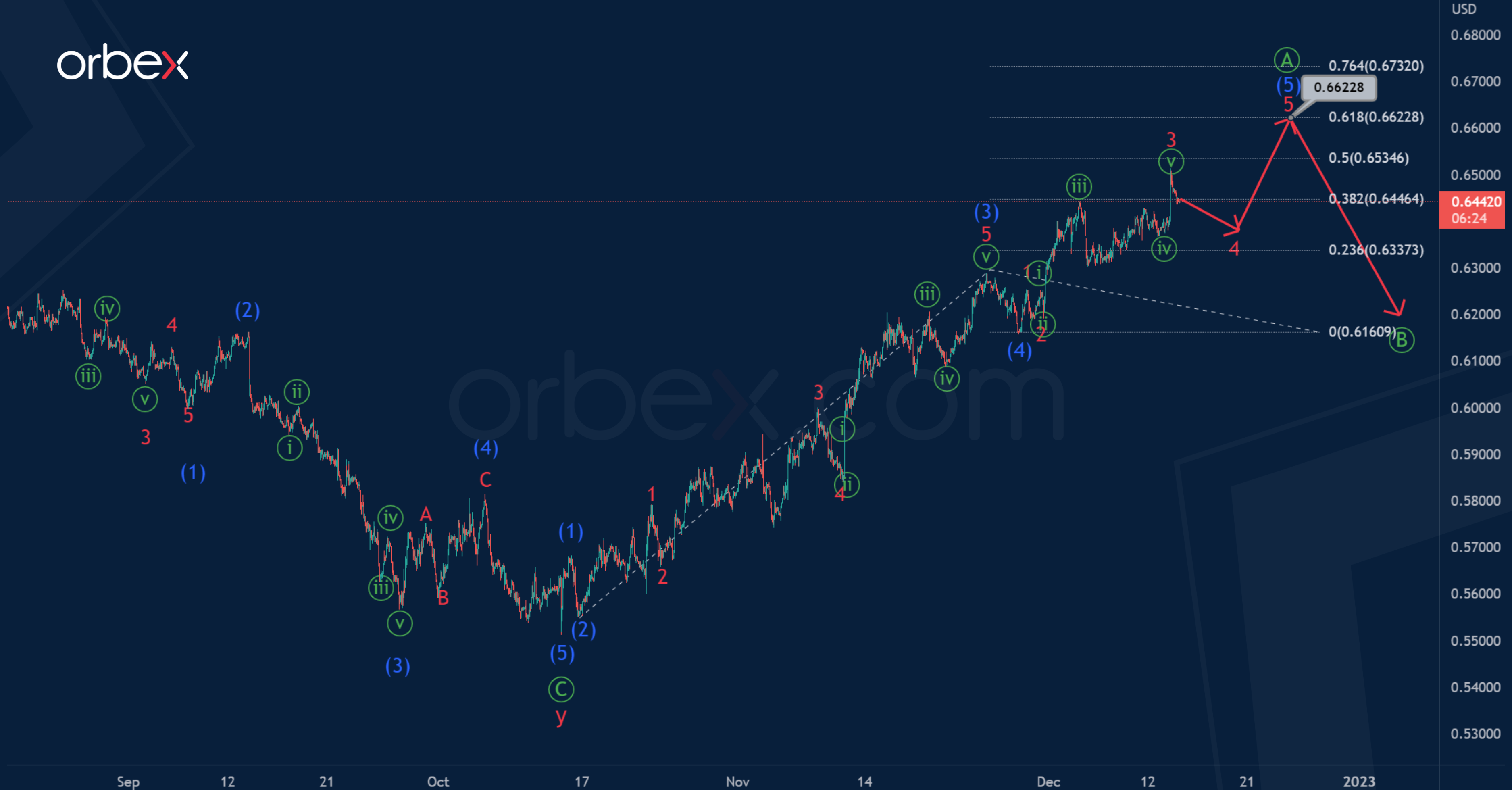 It is assumed that the bulls will push the market to 0.662. At that level, intermediate wave (5) will be at 61.8% of intermediate impulse wave (3).