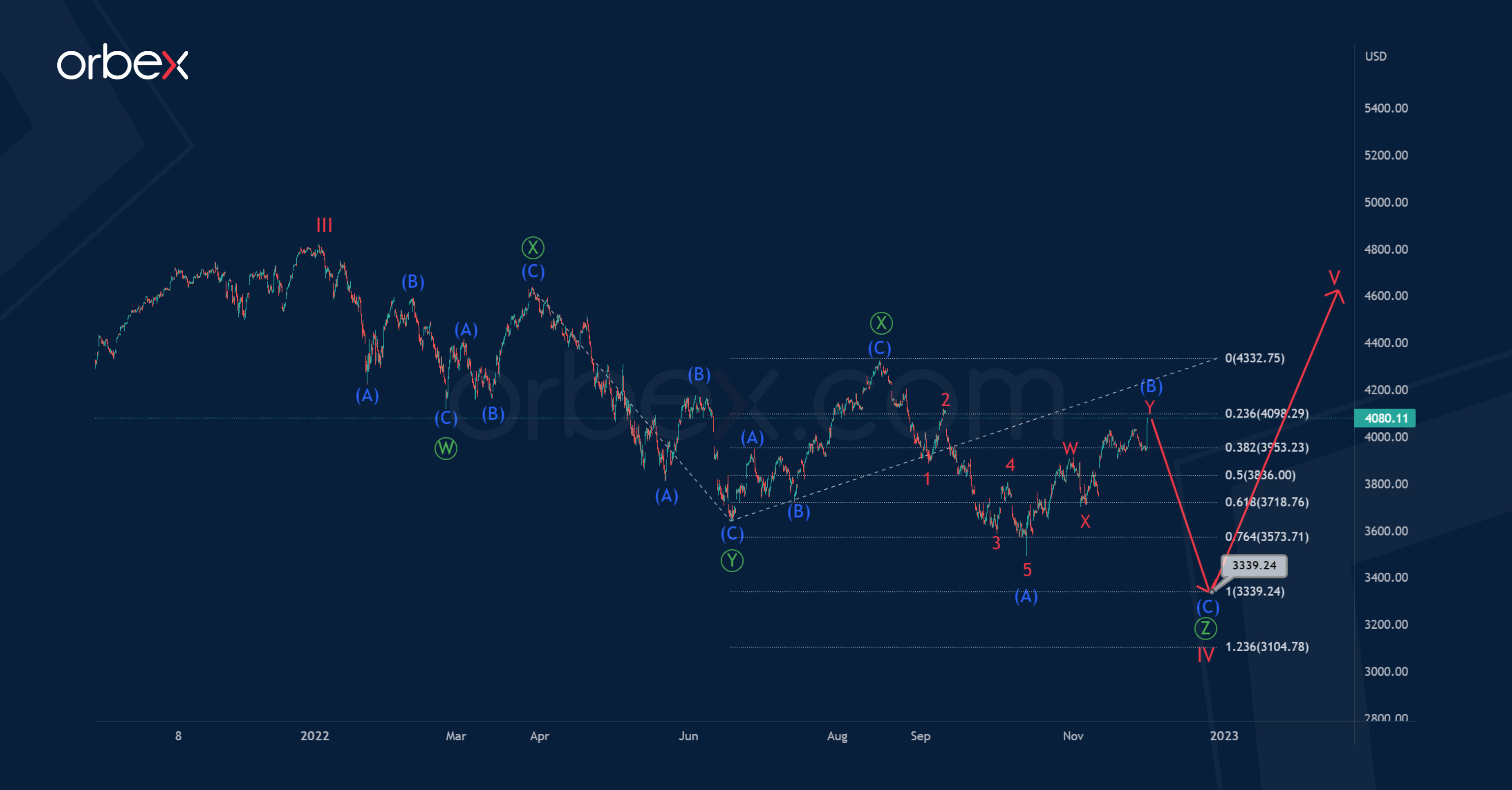 Prices could drop in the SPX500 to 3339.24. At that level, sub-waves Ⓩ and Ⓨ will be equal. Only after reaching the specified level, the price could turn around and start an upward movement. A bearish impulse wave (C) of the intermediate degree is required to complete the wave Ⓩ.