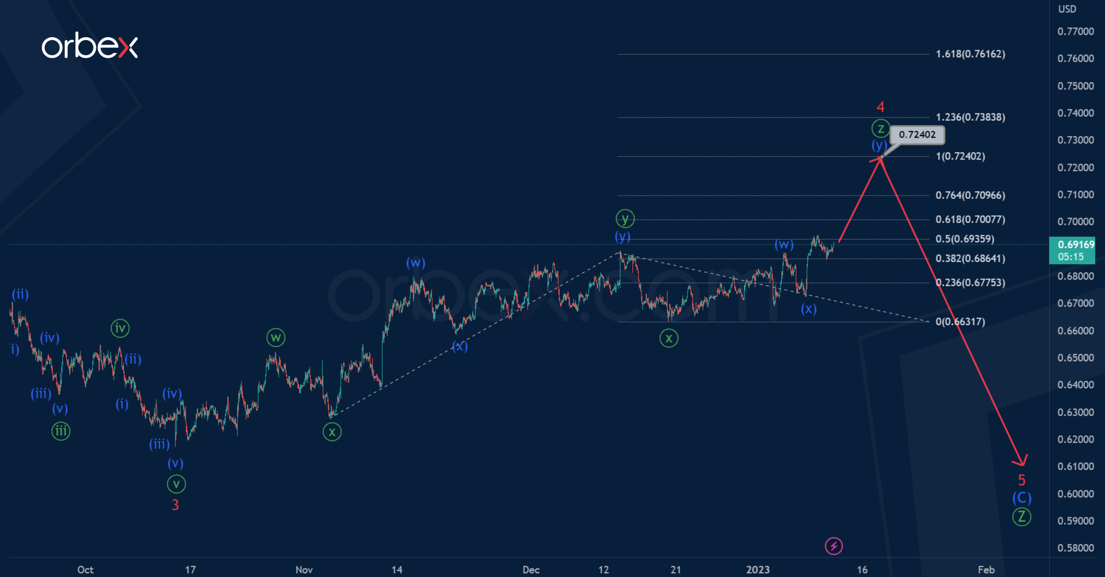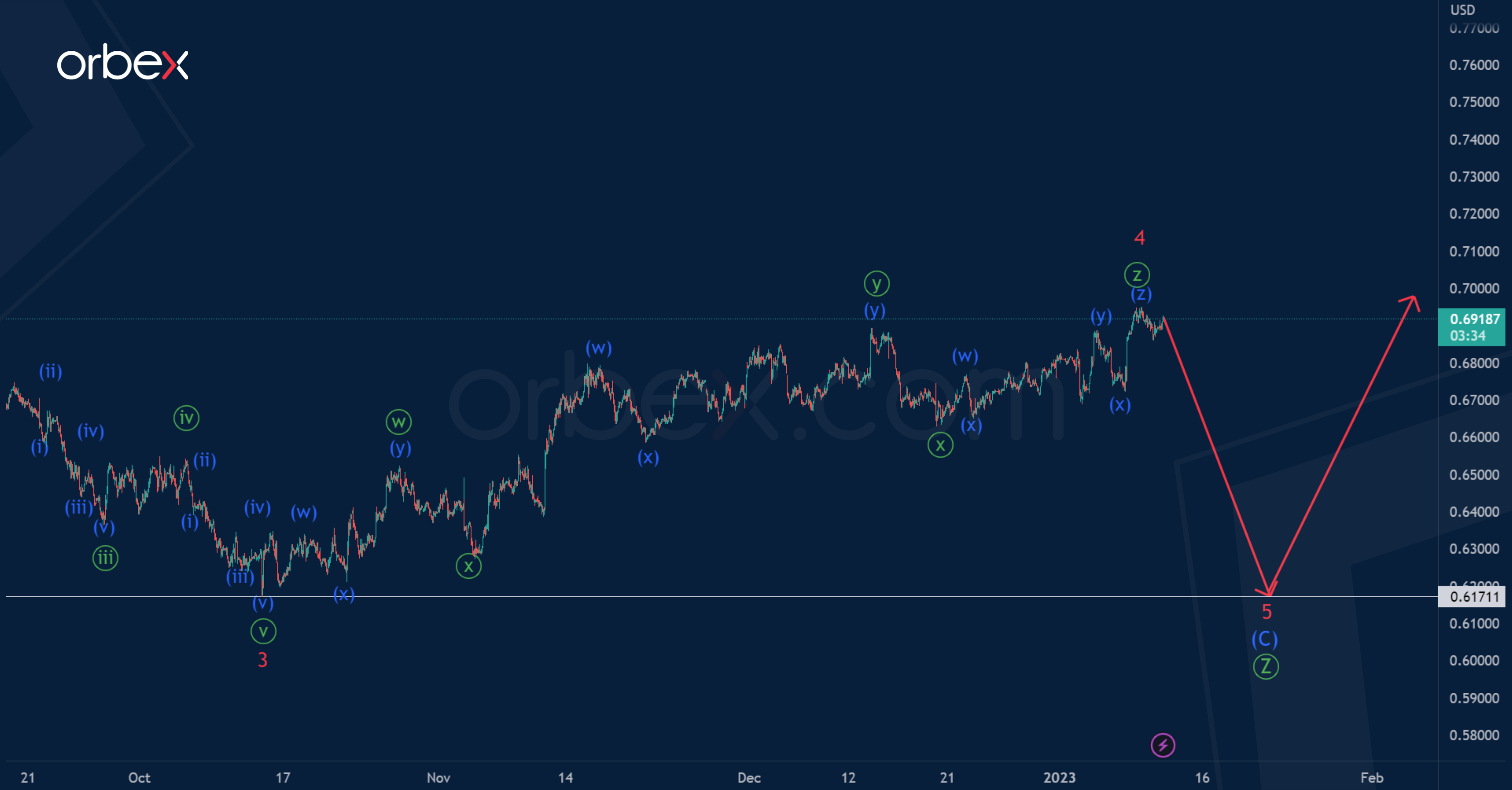 The currency is expected to decline to the previous low of 0.617, marked by the impulse 3.