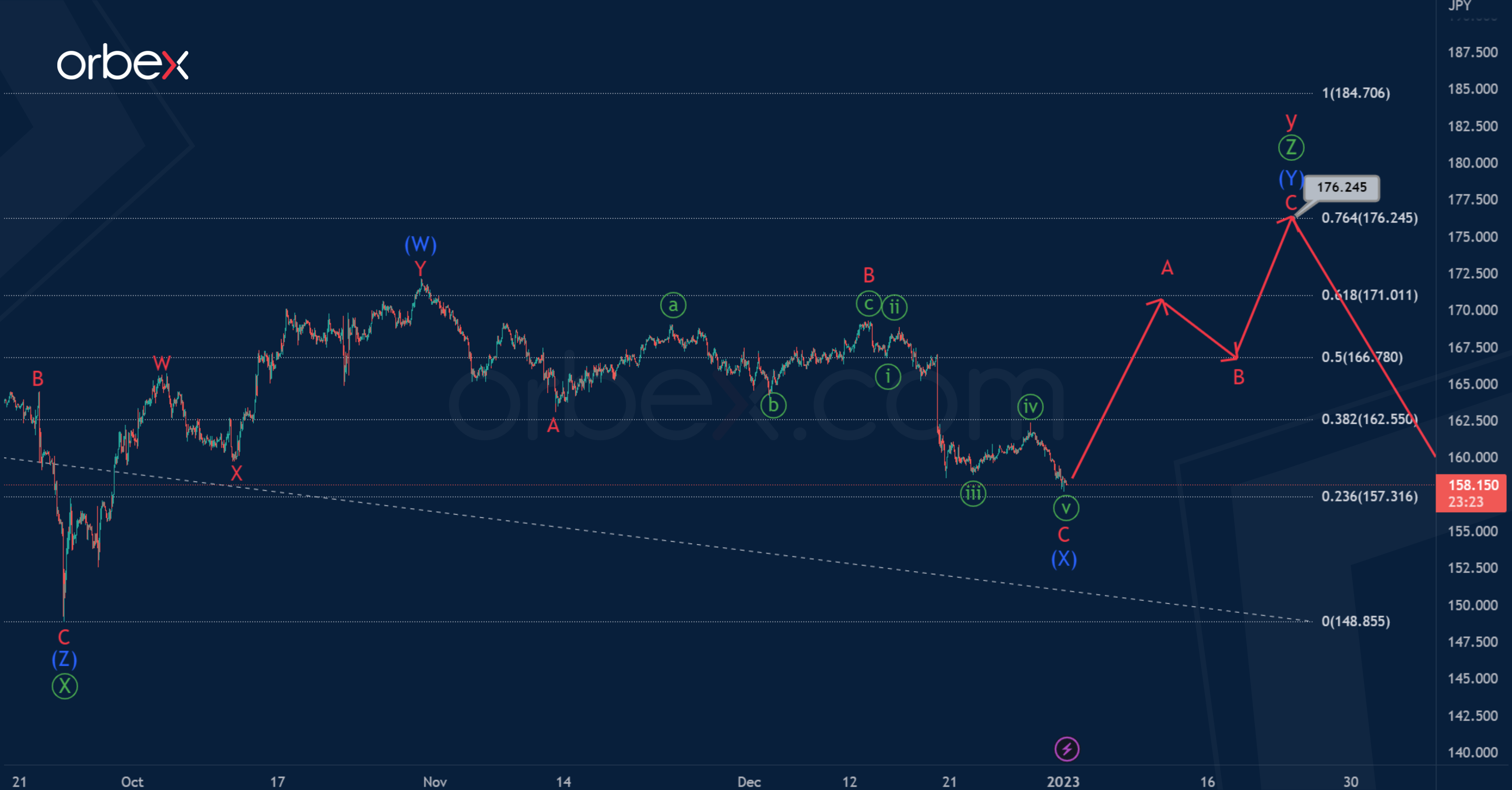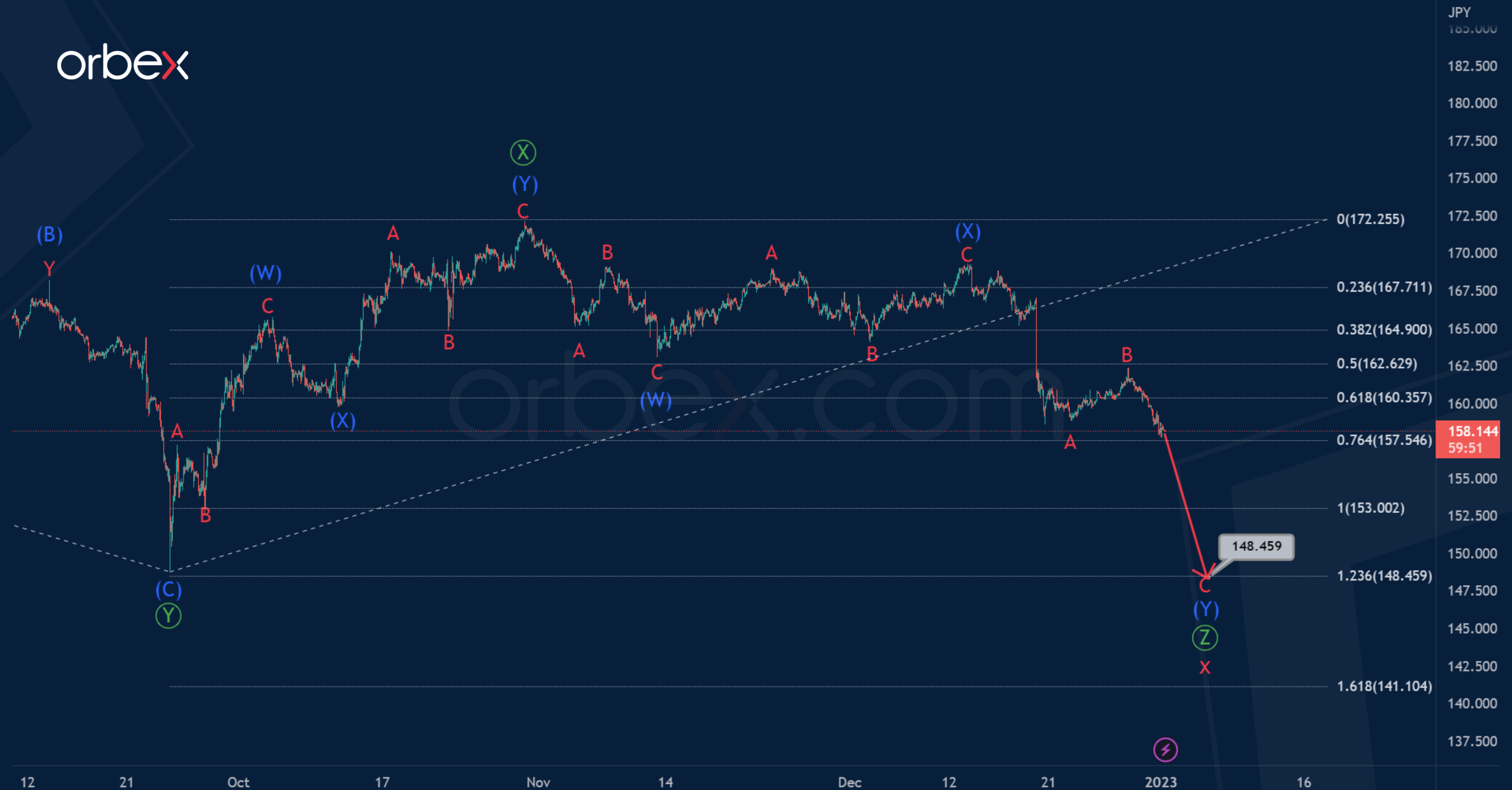 The present structure of the primary wave Ⓩ suggests an intermediate double zigzag (W)-(X)-(Y). The first two zigzag sub-waves (W) and (X) are already finished. Market participants can expect a fall in the sub-wave (Y). With its last impulse sub-wave C, the price may fall to the level of 148.17.