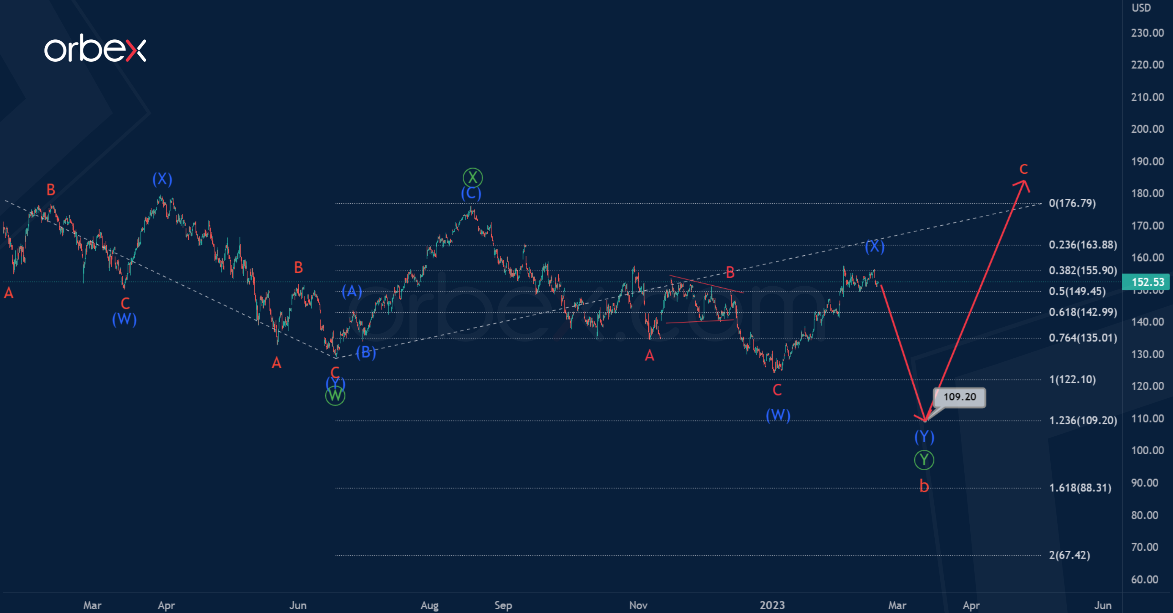 The price in the specified wave (Y) could fall to 109.20. At that level, wave Ⓨ will be at 123.6% of wave Ⓦ.