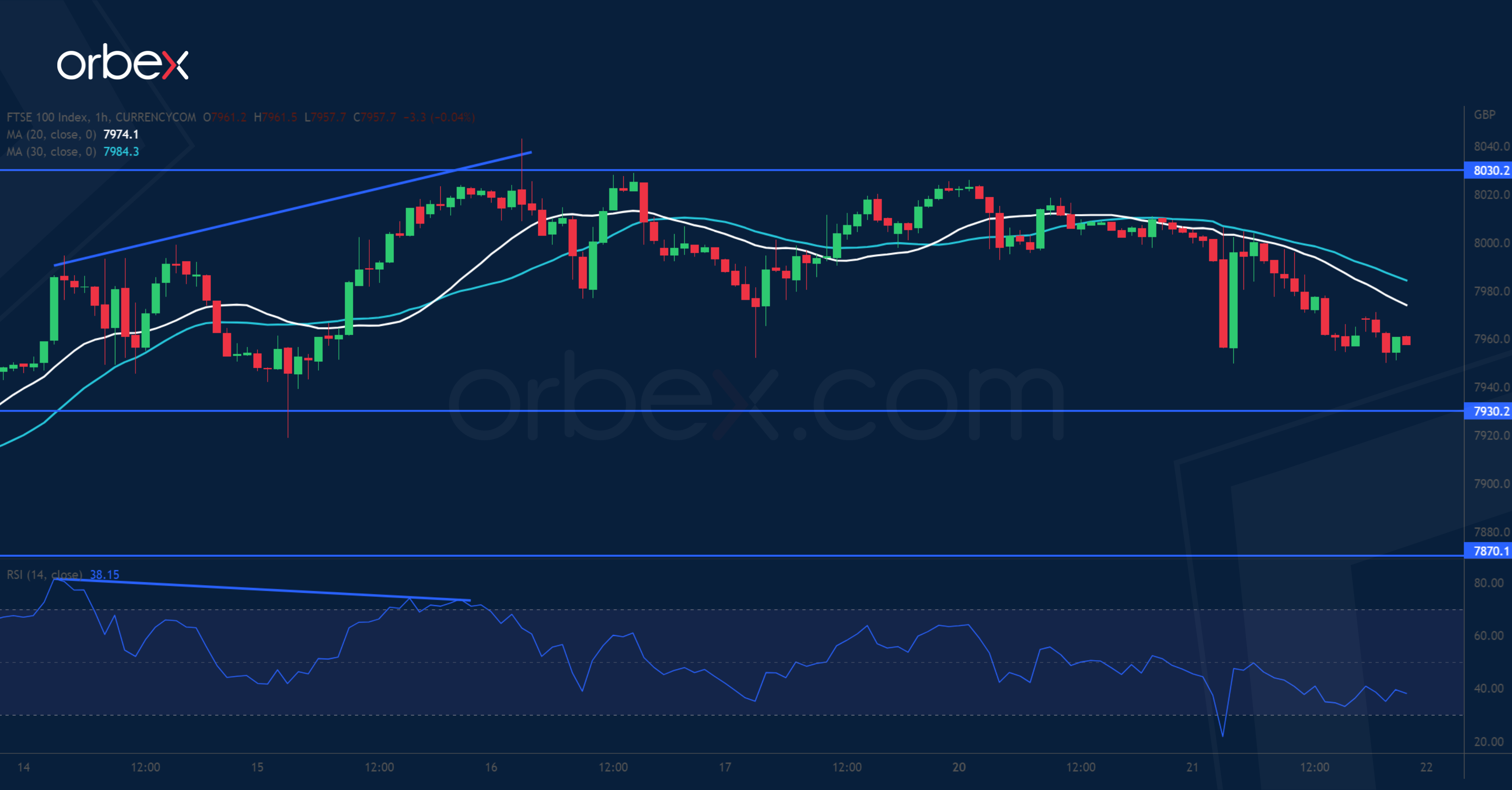 The FTSE 100 turns lower on fears of more rate hikes by the BoE. On the daily chart, the RSI’s overbought condition indicates overextension though there is no confirmation of a fallback yet. A bearish RSI divergence on the hourly chart shows a deceleration. 7930 is the immediate support and its beach may corroborate the observation in these time frames. Then 7870 on the 30-day SMA would be a key level to gauge the strength of follow-up interests. On the upside, a close back above 8030 would resume the uptrend.