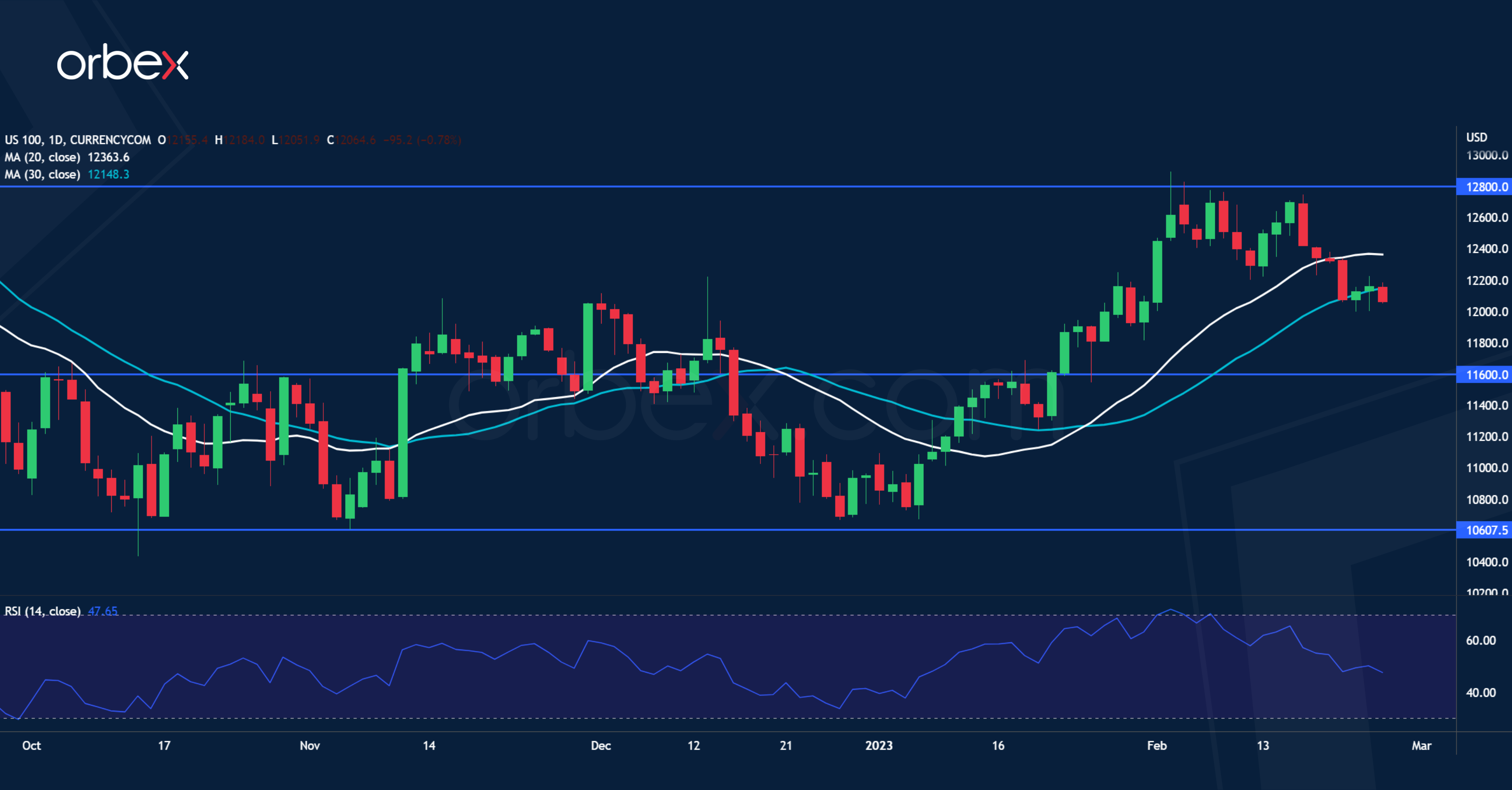The Nasdaq 100 slides as the Fed remains assertive about its tightening agenda. Robust US economic data have been a double-edged sword. On the one hand, they ease fears of a recession. On the other, they may prompt more aggressive interest rate increases by the central bank, pressuring economic growth. All bets are off after the Fed struck a hawkish tone when investors were hoping for the tightening to phase out. Not knowing where the peak rate is is what rattles the market, and three 25 bp hikes are not so different from a 75 bp in one go should that happen. The index is heading to 11600 with 12800 as the closest resistance.