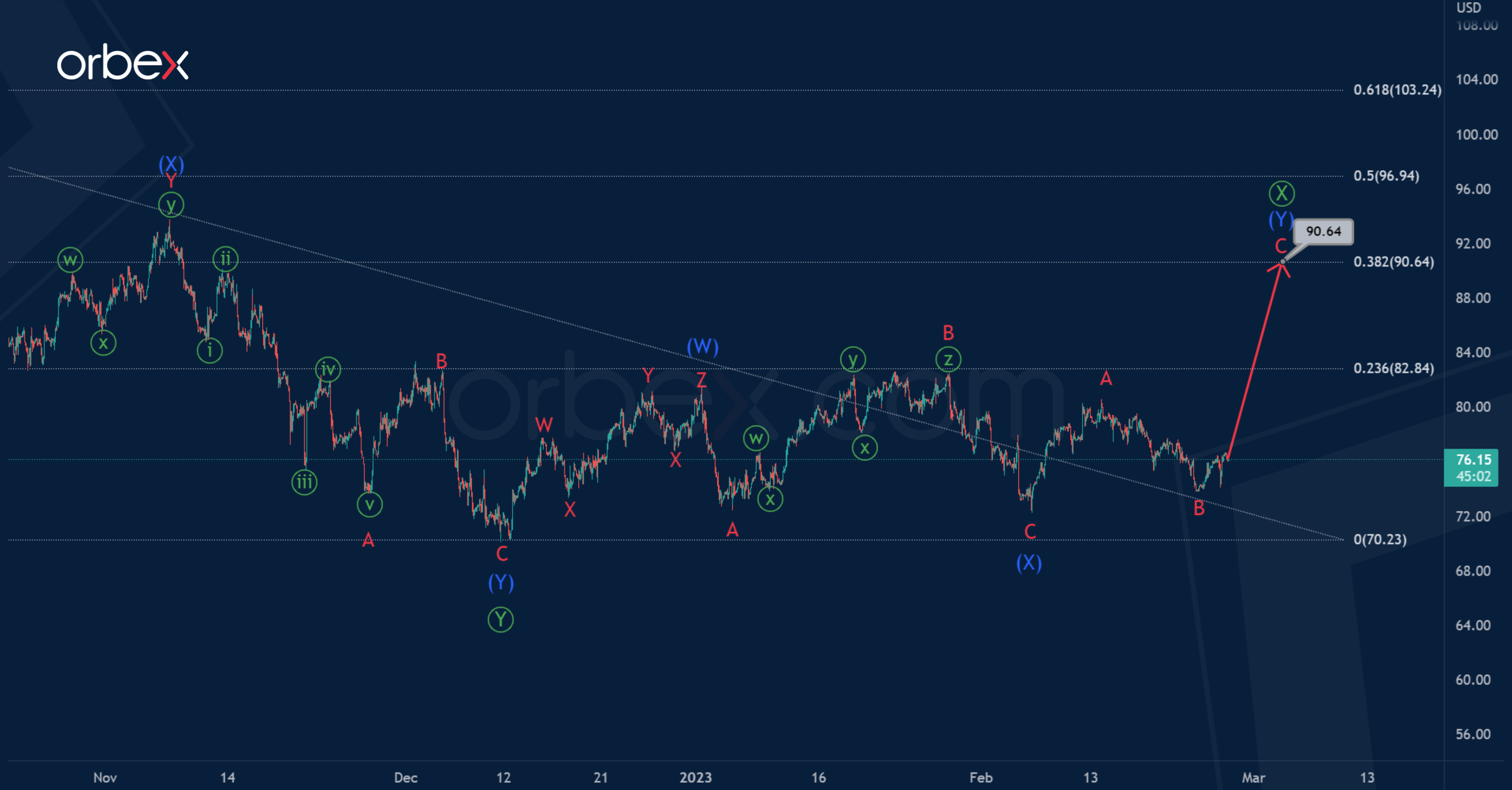 It is likely that the wave (Y) will end near 90.64, taking the form of a zigzag A-B-C. At the specified level, wave Ⓧ will be at 38.2% of wave Ⓨ.