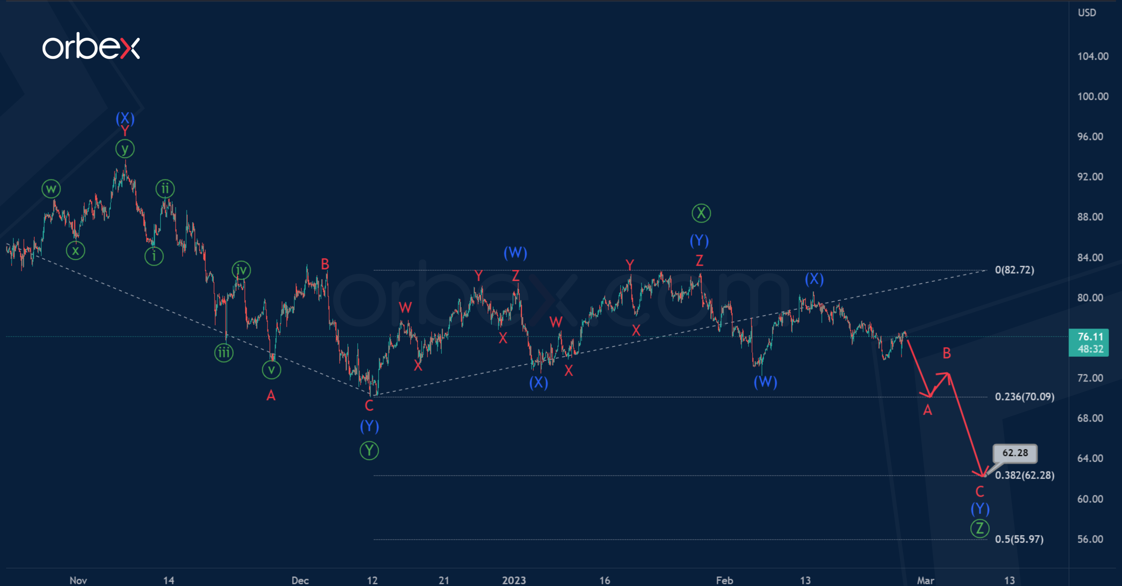 It is assumed that the bearish trend will continue to 62.28. At that level, primary wave Ⓩ will be at 38.2% of wave Ⓨ.