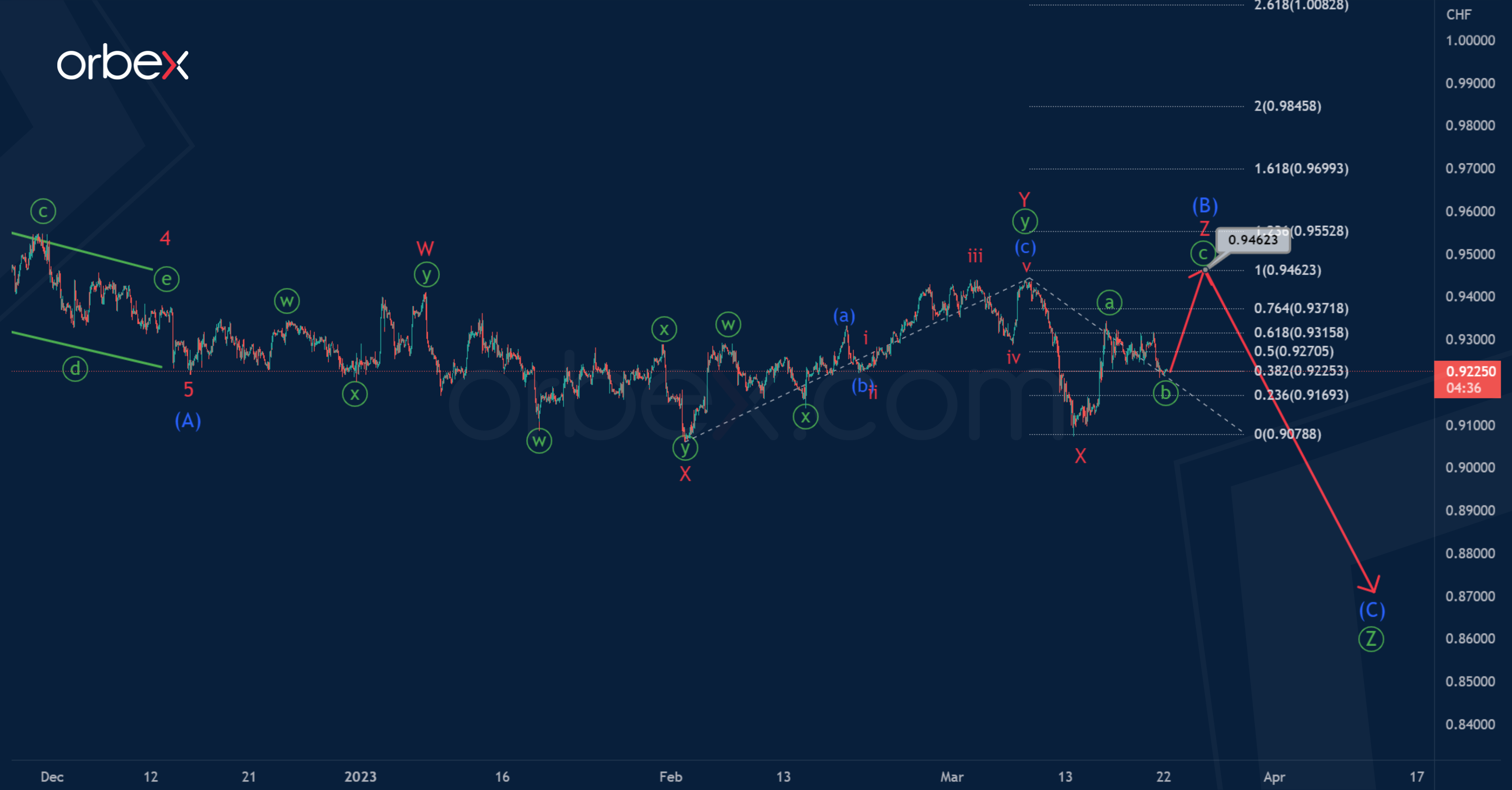 In the long term, the USDCHF pair can build a triple zigzag Ⓦ-Ⓧ-Ⓨ-Ⓧ-Ⓩ. The final wave Ⓩ is under development.