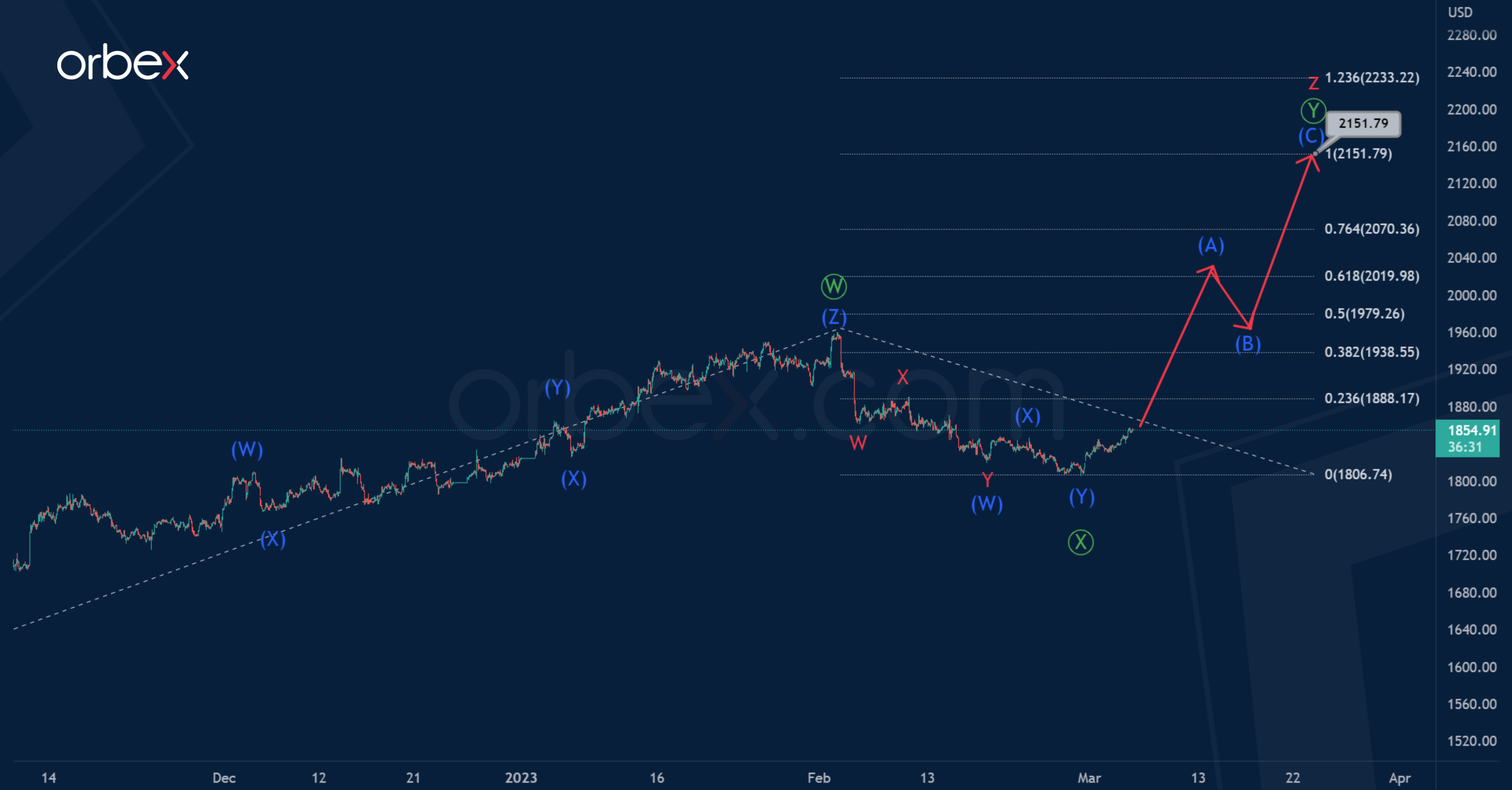 In the long term, XAUUSD looks at forming a double zigzag pattern. This consists of sub-waves Ⓦ-Ⓧ-Ⓨ inside the cycle wave z.