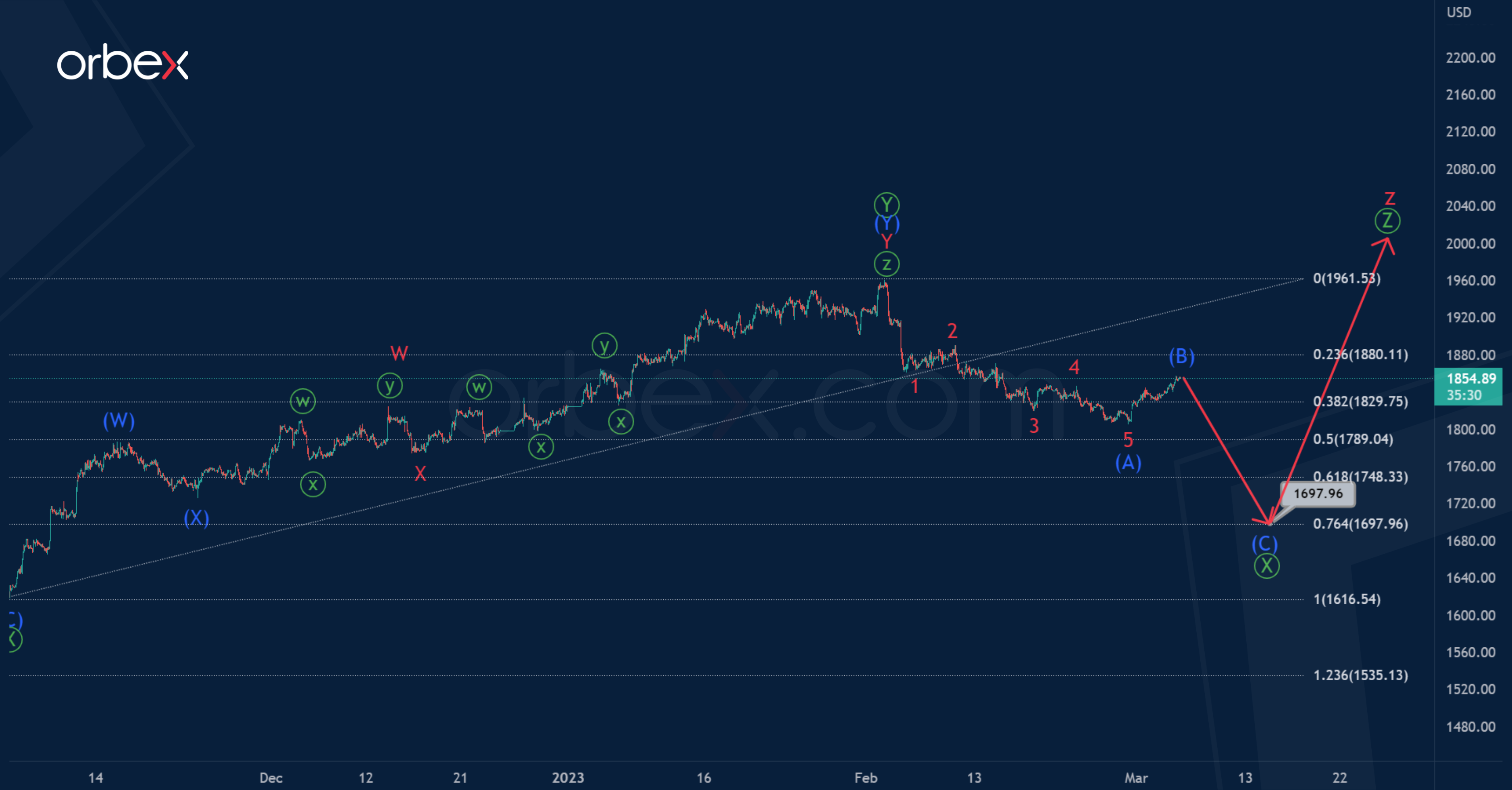 Thus, in the near future, the price could move lower and form a primary intervening wave Ⓧ. This is like an intermediate zigzag (A)-(B)-(C).