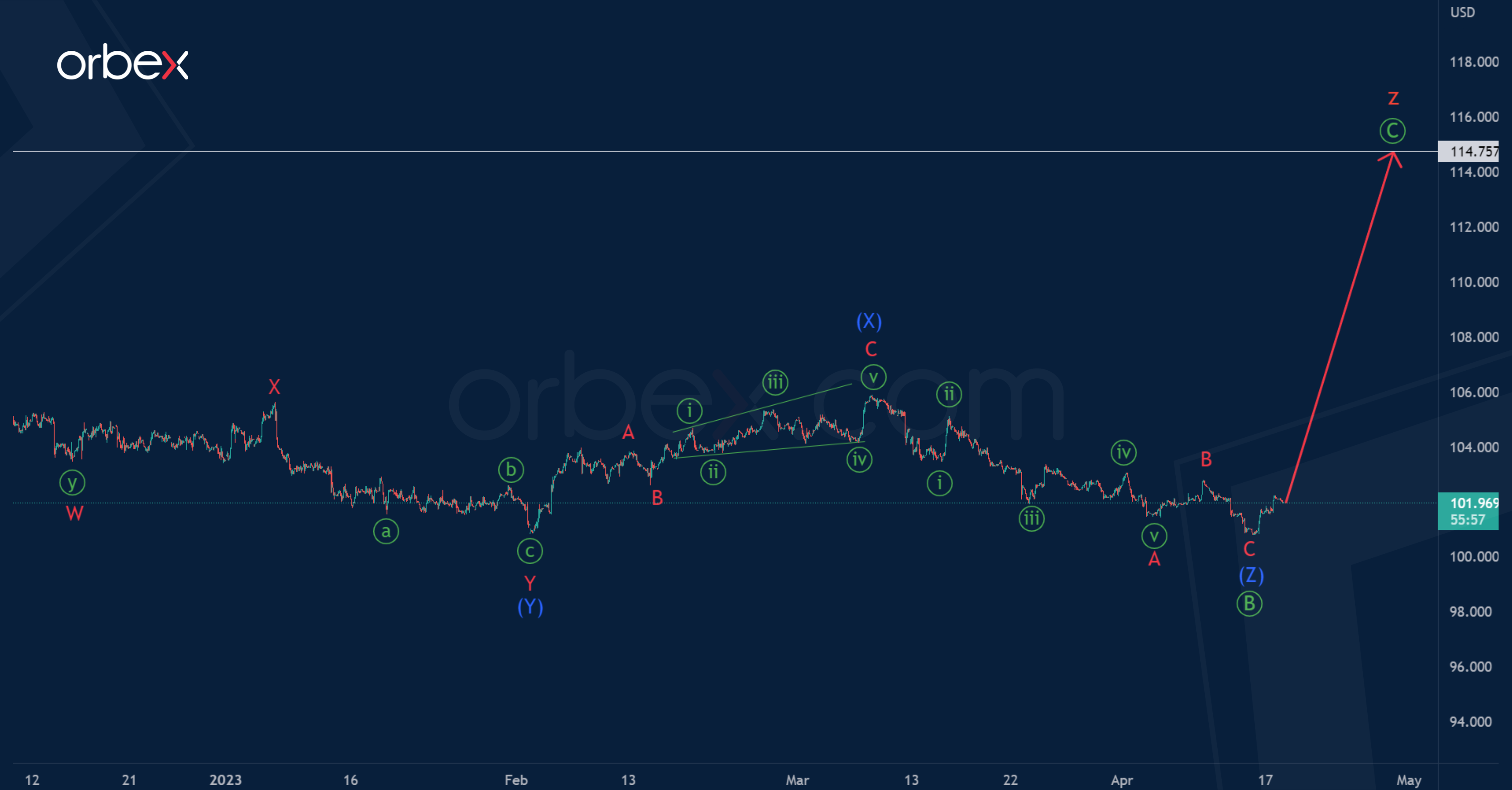 The cycle wave z is similar to the zigzag Ⓐ-Ⓑ-Ⓒ. In its composition, the first impulse Ⓐ and the correction Ⓑ in the form of an intermediate double zigzag have already been completed. The entire wave z may end near 114.75.
