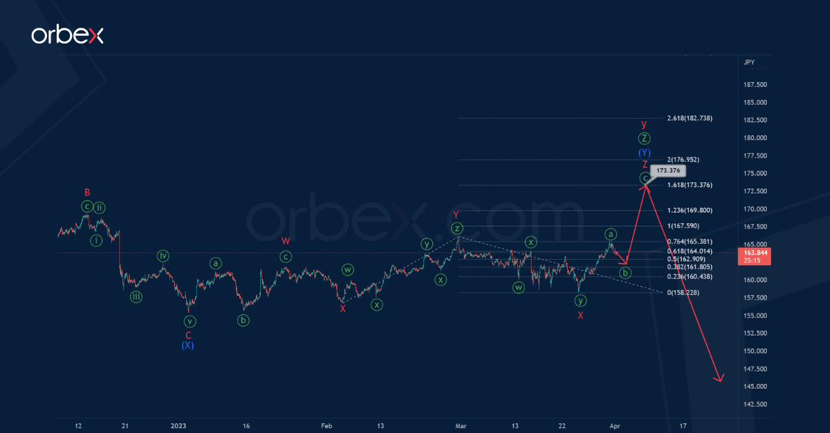 The structure of the final primary wave Ⓩ, at the time of writing the review, suggests an intermediate triple zigzag (W)-(X)-(Y)-(X)-(Z). The first four zigzag sub-waves have ended. In the next coming trading days, we are waiting for a drop in the sub-wave (Z) to the mark of 152.50.