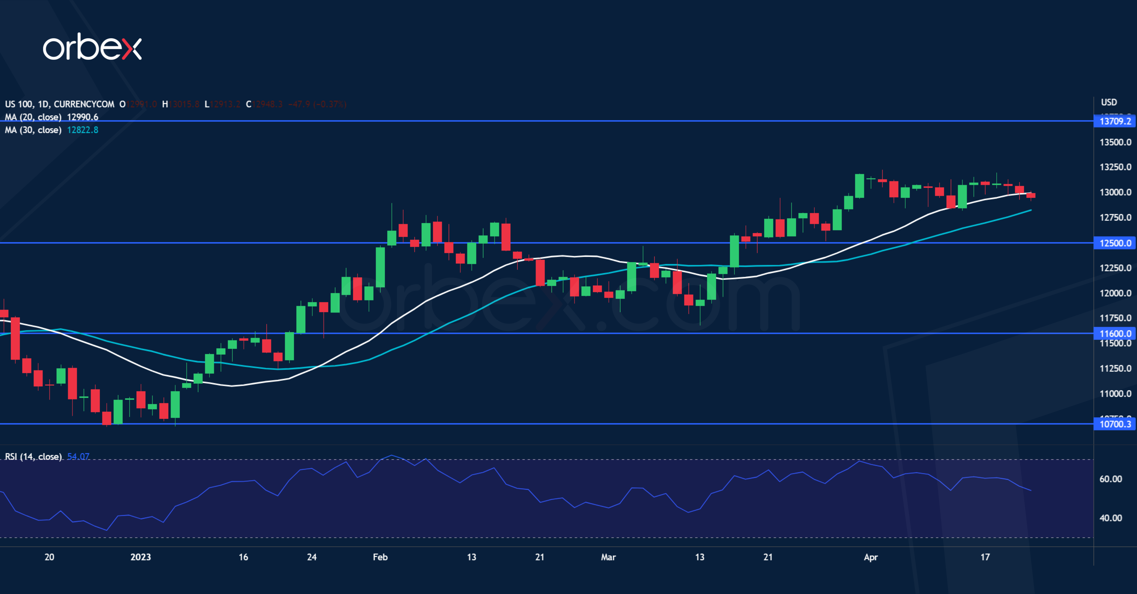 The Nasdaq 100 tries to hold on to gains as first quarter earnings fail to impress. The Fed has signalled they are approaching the end of its aggressive policy tightening campaign, with probably one last hike of 25 basis points to go. However, mixed messages from officials sowed doubt that rate cuts would come soon this year as there are still hawks advocating a rise above 5%. Lacklustre Q1 earnings cast a shadow on the economic outlook. The market darling Tesla’s earnings miss amid a price war in the electric vehicle market suggests that the Fed-engineered ‘soft landing’ is under way. 13700 is the hurdle ahead and 12500 a close support.