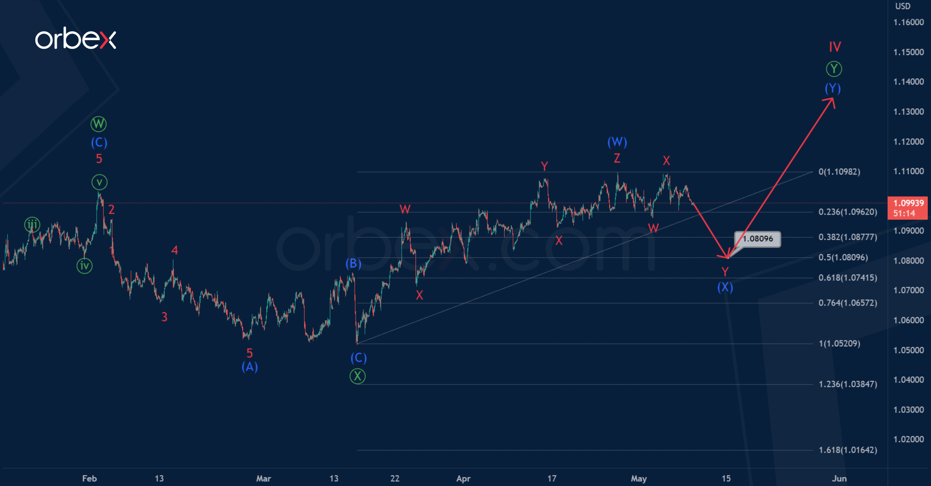 For the EURUSD pair, we can observe the formation of a correction wave IV inside a large impulse. Cycle correction IV, most likely takes the form of a primary double zigzag Ⓦ-Ⓧ-Ⓨ.