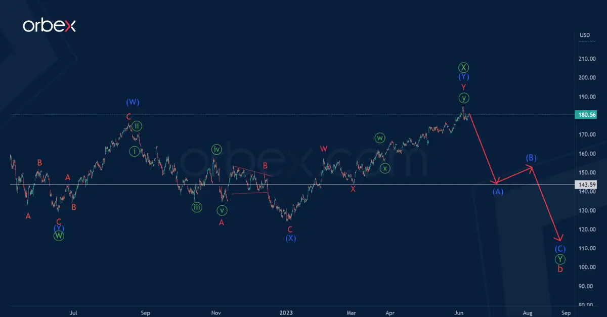 Today we will consider the situation on AAPL shares. Apparently, the market is forming a correction pattern – a cycle zigzag a-b-c.