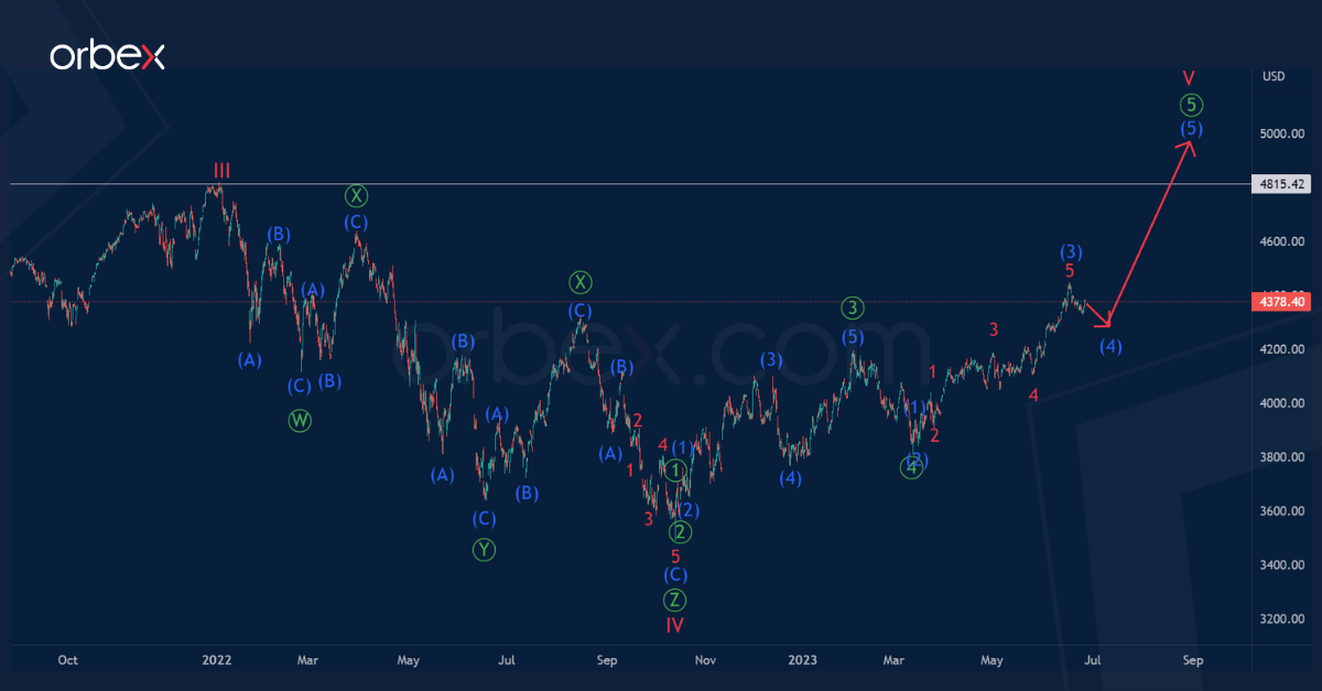 Probably, four parts have been completed as part of impulse V to date. In the near future, the market may move up to a maximum of 4815.42 in the sub-waves (4)-(5) inside the primary fifth wave. The level of 4815.42 was marked by cycle impulse wave III.