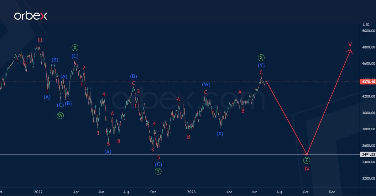 It is possible that the actionary wave Ⓩ will end at the minimum of the wave Ⓨ, that is, near 3491.23.