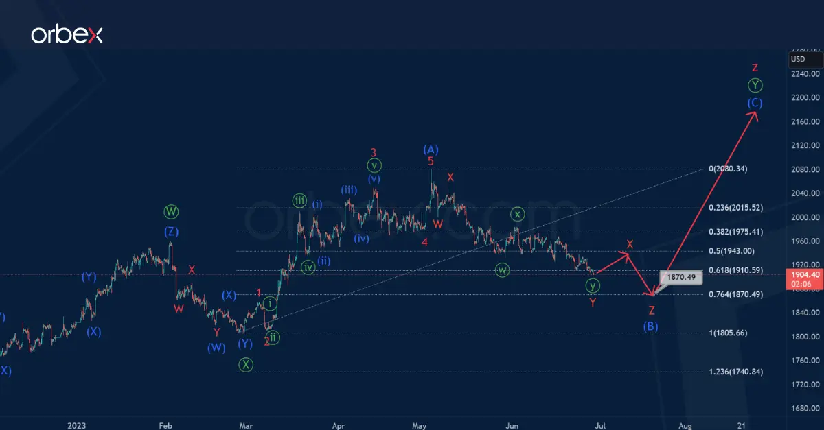There is a possibility that Gold in the long term builds a primary double zigzag consisting of three main sub-waves Ⓦ-Ⓧ-Ⓨ