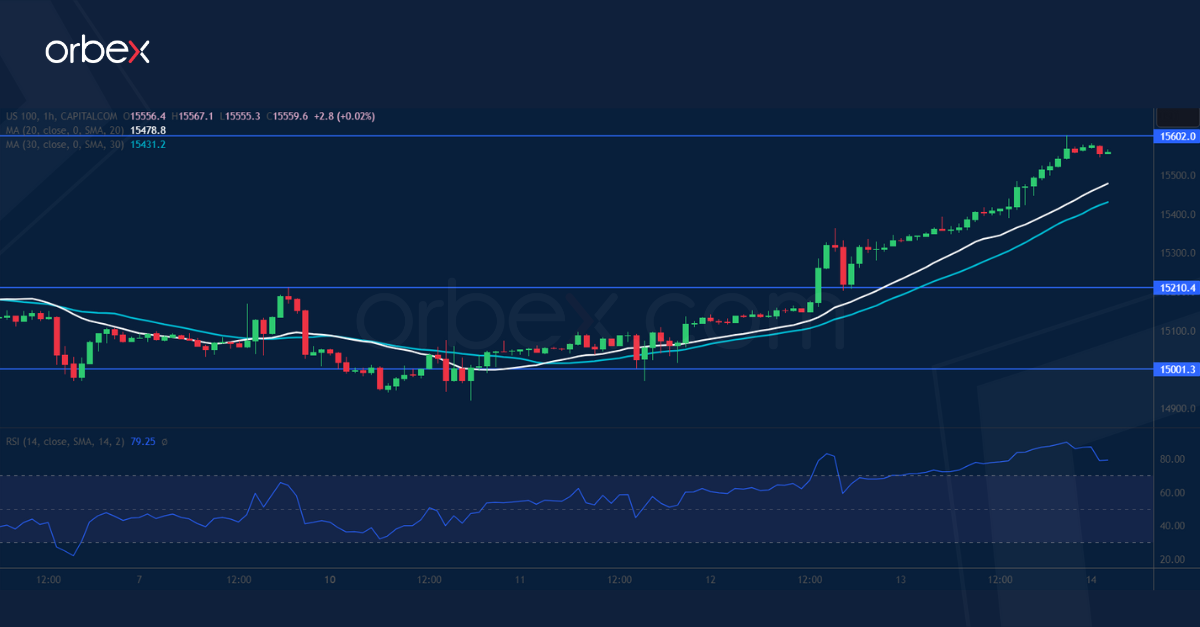 The Nasdaq 100 jumps higher as rate hike fears ease across markets. Despite a bit of whipsaw, the demand zone formed by the psychological level of 15000 and the 20-day SMA has seen a buildup in the buying pressure. A subsequent pop above 15270 may have cleared sellers’ last stronghold and forced them to switch sides, turning 15210 as the latest support. As trend followers join the auction, they may see any fallback as an opportunity to stake in. The index is on its way towards 16000 with 15600 as the next target.