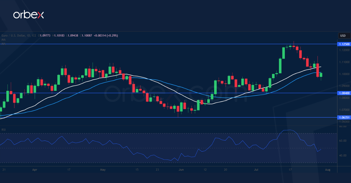The euro drifts lower as the ECB makes its next move conditional. After its ninth consecutive interest rate hike, the ECB wants to keep all options on the table for September. That could be interpreted as a dovish shift revealing a split among policymakers, between those who see a greater risk of recession and those who are determined to “break the back” of inflation. Record-low unemployment might keep inflationary pressures up, but should the upcoming CPI confirm a steady downtrend, the central bank would be incentivised to pause its tightening. The pair is pulling back from 1.1250 and may test 1.0840.