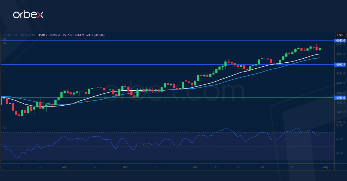 The S&P 500 hits a 16-month high as a potential Fed hike pause drives risk-taking. Chair Jerome Powell has stated that further decisions would be data dependent, leaving the door open for future adjustments. While it means that more hikes are probable and a rate cut this year unlikely, conditionality makes the tone softer, and would encourage speculations for a policy hold in September. In the meantime, tech megacaps’ heavy involvement in the AI space definitely contributes to the euphoria and helps investors look past a bag of mixed quarterly results. The index is testing the key resistance of 4640 and 4390 is the first support.