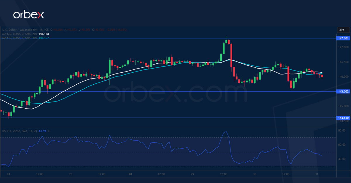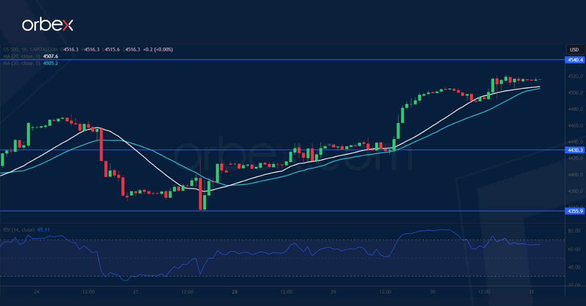 The S&P 500 climbs as signs of a cooling US economy boost the rate-pause optimism. A surge above 4470 and then 4500 has forced sellers to cover, potentially putting the index back on track. A break above the support-turned-resistance of 4540 could trigger a bullish continuation. In the meantime, the RSI’s another venture into the overbought area may lead to a temporary retracement, which could be seen by the bulls as an opportunity to stake in as sentiment seems to be turning around. 4430 would be the closest support.