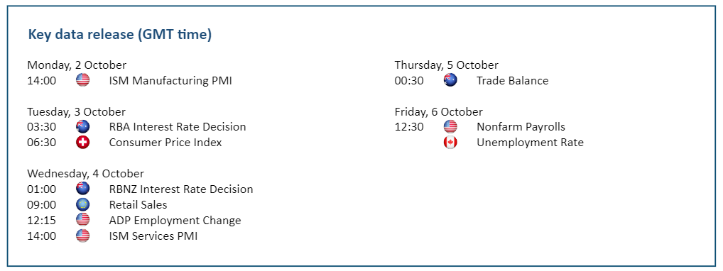 The Nasdaq 100 steadies as market participants put faith in a soft landing of the US economy. The recent surge in Treasury yields to a 16-year high was a reminder that uncertainties are still holding some investors back, putting equity markets under pressure. From US-China trade tensions to data guesstimates, the bulls may find it hard to push forward. The upcoming nonfarm payrolls could be a strong catalyst as a tight labour market has been a thorny issue for the Fed. A slowdown in job addition or an uptick in the unemployment rate could put policymakers at ease and send the tech index towards 15900 with 14250 as a fresh support.