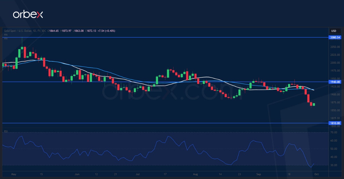 Gold sank to a six-month low as the US dollar advanced due to the Fed’s hawkish hold. One might ask why a series of uncertainties from China’s economy to rising energy prices has not popped up demand for the traditional safe haven metal. Truth is Treasury yields offering a virtually risk-free return of 5% have become the sought-after substitute to the non-yielding metal. As traders bet on American exceptionalism thanks to rosier economic data in comparison to other developed economies, inflows into dollar assets mean fewer bids for bullion. The price is falling to March’s low of 1810 and 1940 is the closest resistance overhead.