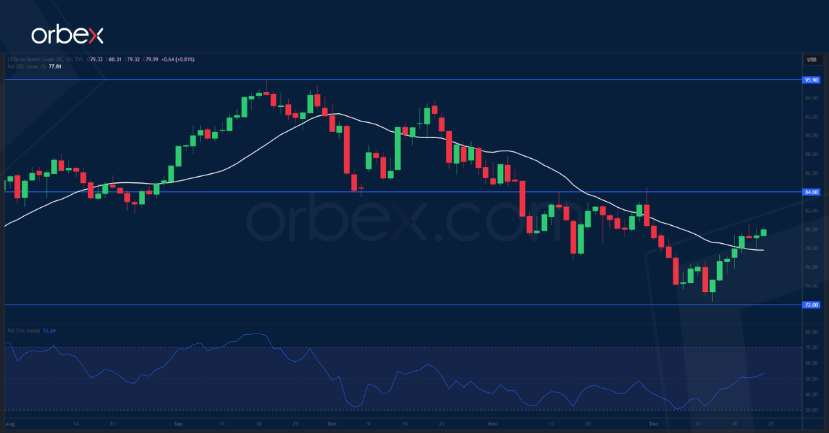 Brent crude remains under pressure due to a gloomy demand outlook going into a new year. Recent market jitters reflect concerns about global trade disruptions due to tensions in the Middle East. The US Treasury toughened sanctions on Russian oil by making it harder for Russian exporters to circumvent the price cap. However, the impact on oil supply could be limited. The underlying driver of the market remains sluggish global demand and China’s economic headwinds, while sporadic buildups in US crude stocks might add a little extra pressure. 84.00 is the immediate resistance and 72.00 a crucial support to defend.