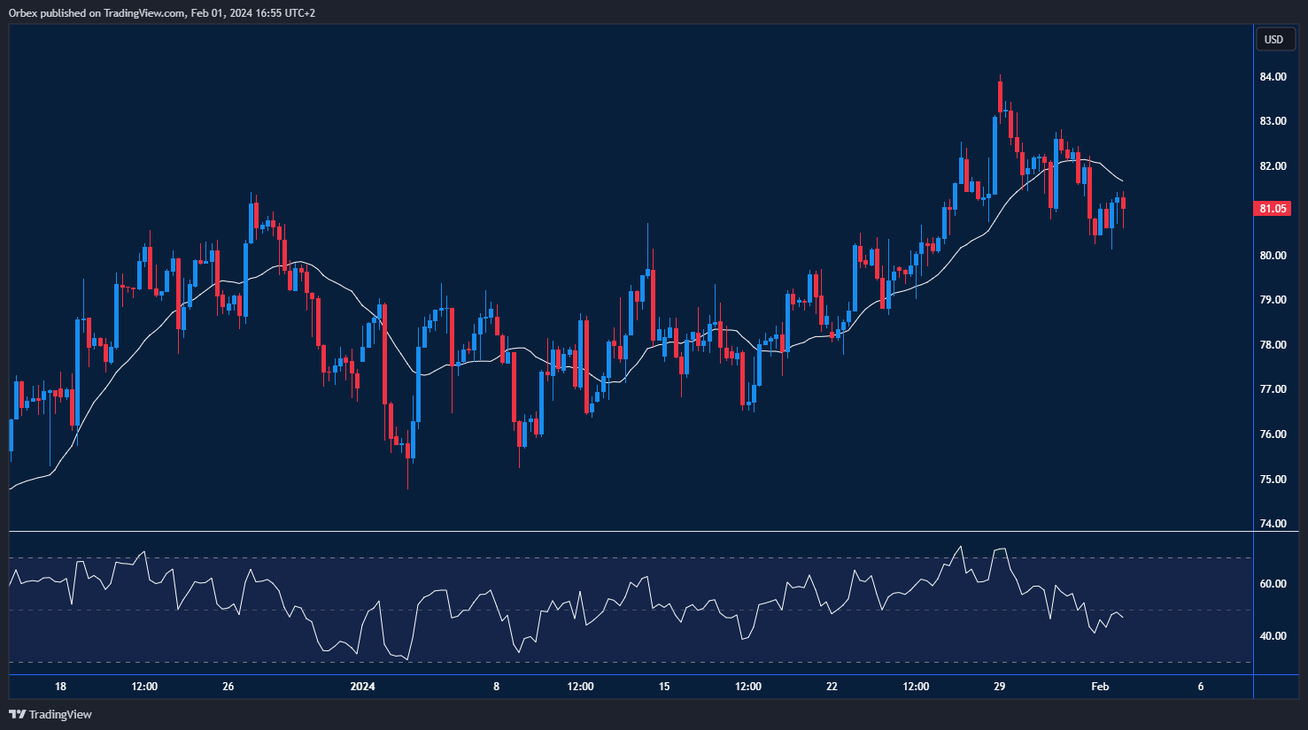 Brent crude slipped after a rally towards 84.00 saw the black gold lose momentum. With the IMF boosting its global growth forecast for the year, the market now awaits to see how the world will respond to the uncertainties in the Middle East. Despite a pickup in Chinese economic momentum, stimulus in the country could lead to a more positive undertone. However, a drop in China’s imports due to the Lunar New Year holidays has kept traders on their toes. The commodity looks for support at 80.00, with 84.00 being a top.