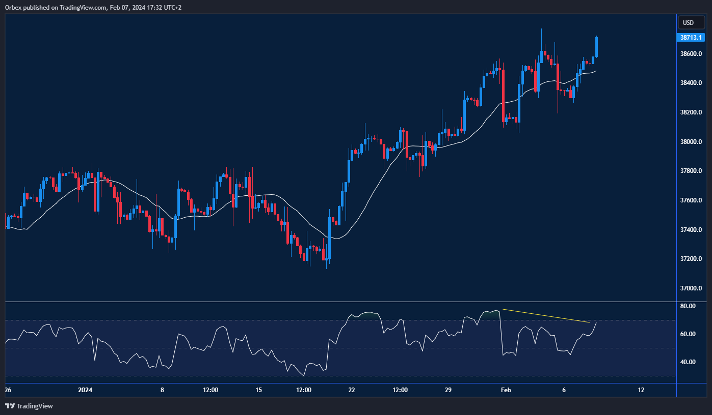 The Dow Jones maintains its upward momentum, defying any signs of slowdown. The recent 500-point surge encountered robust buying activity above the daily resistance level of 38400. Despite a bearish divergence observed on the RSI, traders anticipate another record high, underlining the importance of our Dow analysis. Notably, the pivotal support at 38500 may prevent a decline towards the critical floor of 38000