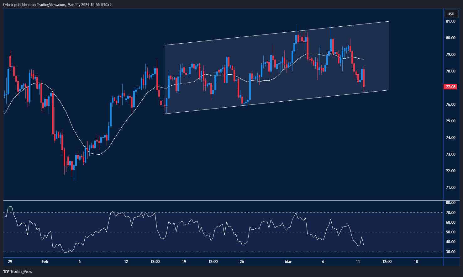 WTI crude continues to climb as the outlook for 2024 sees increased demand for black gold. After a month-long consolidation, prices are now in a bullish channel. A fall below the first support of 76.00 could trigger a correction towards 74.00. However, with the price likely to bounce, is now looking to recapture the 78.00 handle soon. After that, another run at the top channel to 80.25 could be tested.