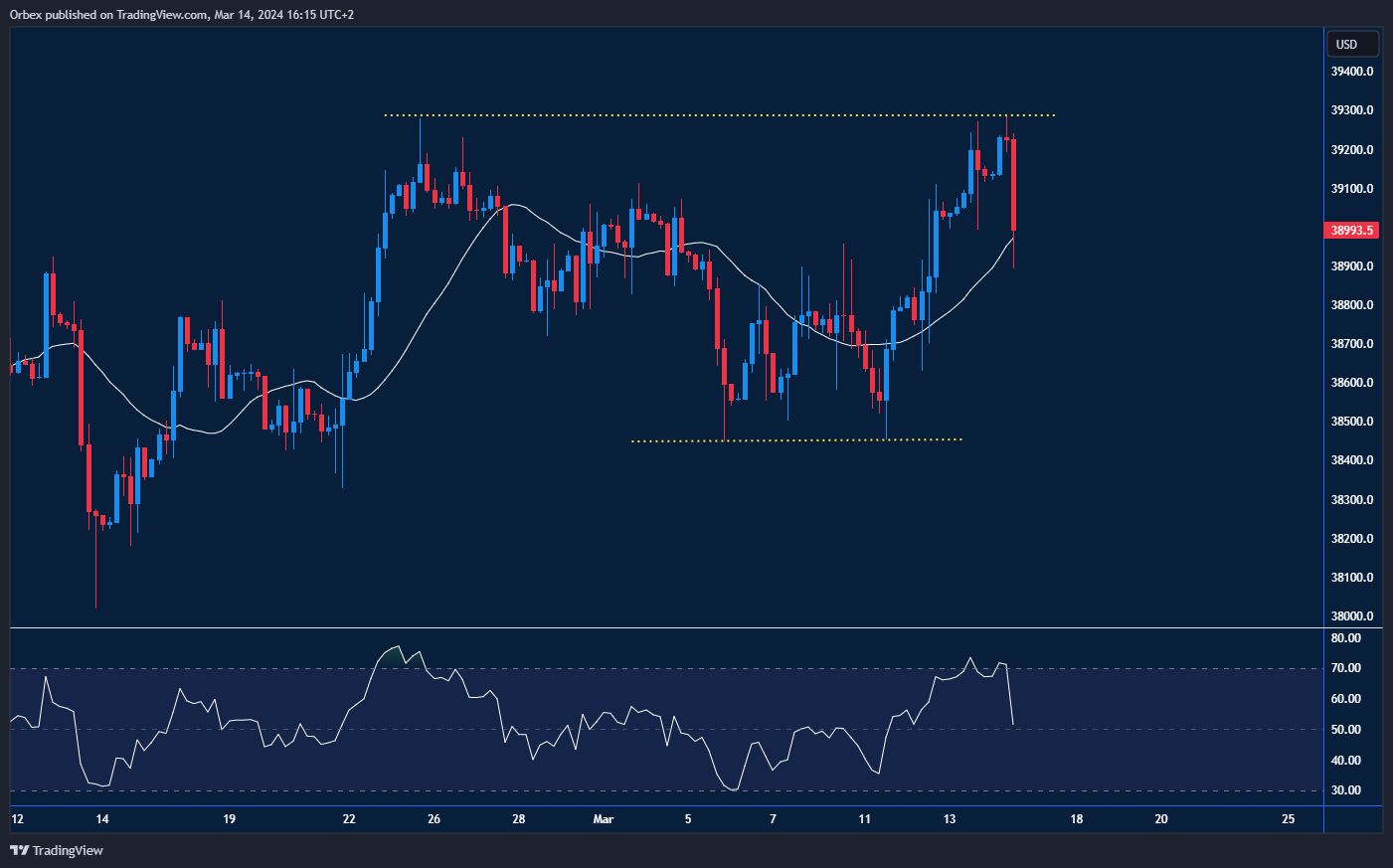 The Dow Jones 30 clawed back some losses as traders cautiously waited for the Fed’s next move. As the sideways consolidation continues, a drop of 300 points has awoken the bears. A drop down to 38450 is next, but it needs a 38750 break first. Failing that, the current trend could be ignored, with a break above 39300 leading to more record highs in the medium term.