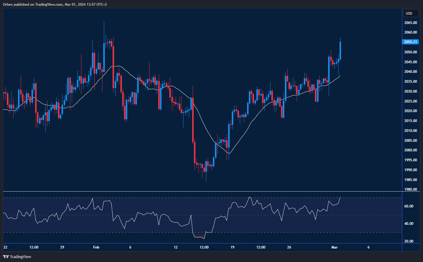 The gold chart shows that gold kept the bullish rally going after another $20 move. A pop above the immediate resistance of 2045 has prompted buyers to attract more buyers as the price moves towards the recent swing high. 2060 is the next target, with a move to 2100 on the radar. However, a bearish reversal would clear the path for a move towards 2030, currently sitting next to the 20-day SMA and then 2010. See this gold chart for more insights.