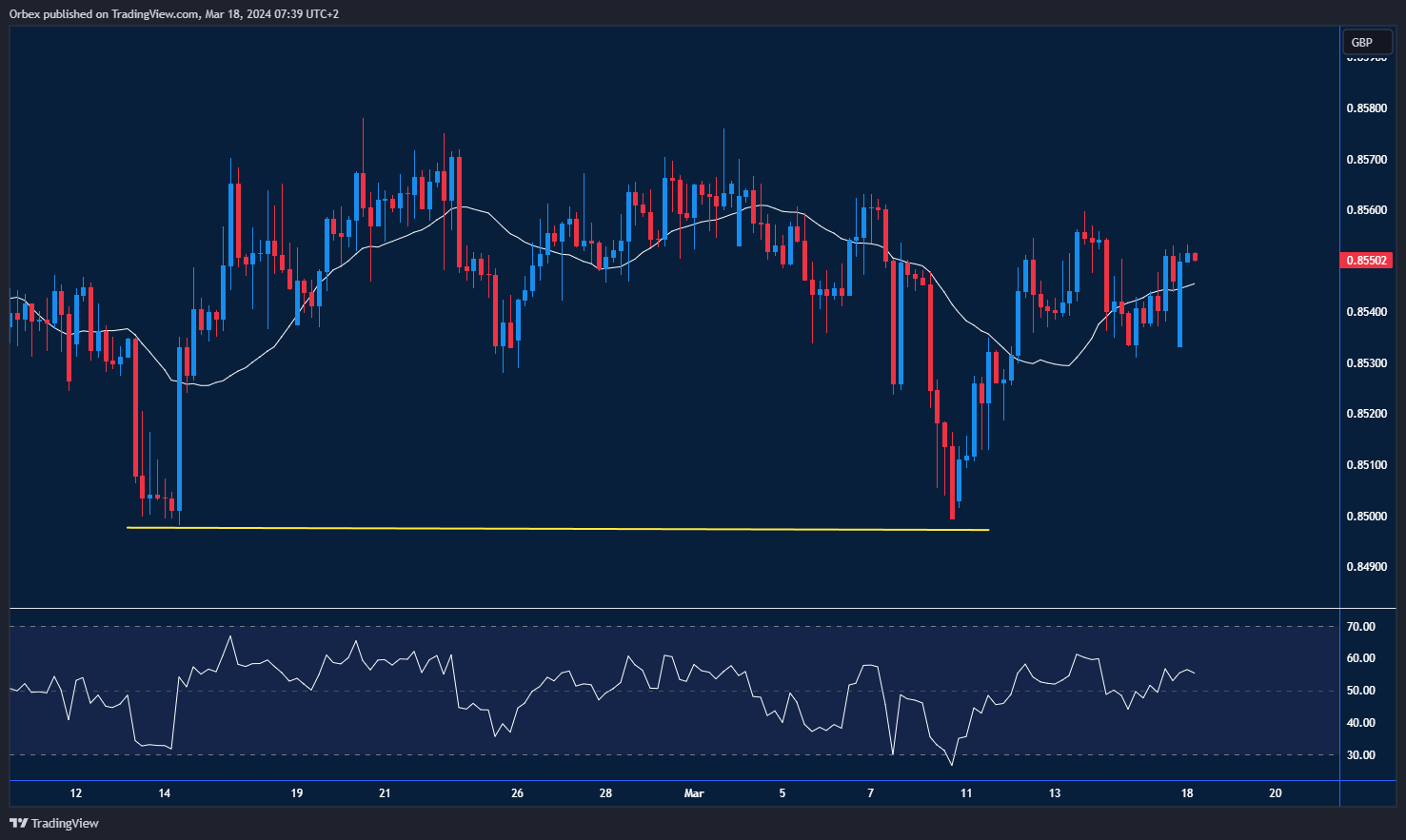 The pound struggled as industrial and manufacturing data declined. The euro has bounced off this year’s low around 0.8500, and a surge above the vital area 0.8530 prompted sellers to cover positions, easing the downward pressure. As the RSI remains neutral, the next step is to see further buying. A close above 0.8570 would attract more momentum buyers and extend the rally to the January high of 0.8700.