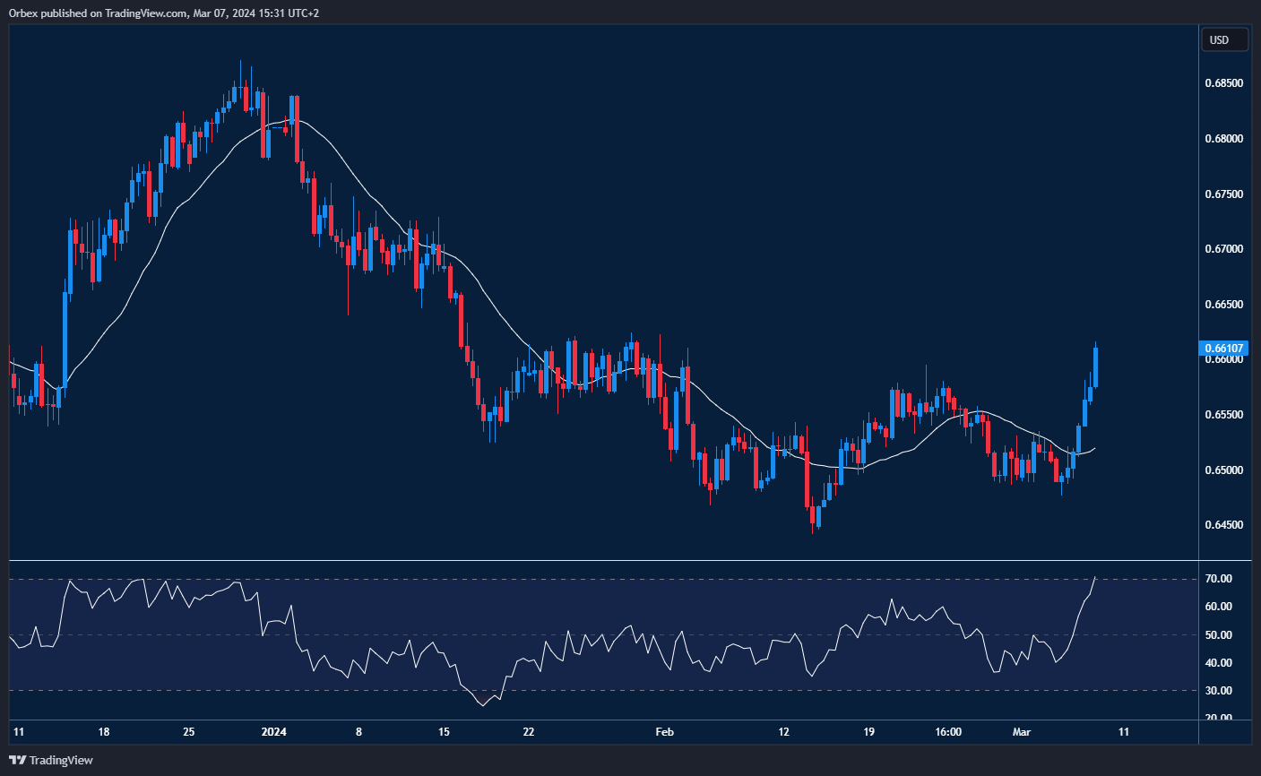The Australian dollar gathered strength after a pop above the latest resistance of 0.6600. The weakness in the greenback is being felt further afield, even if Australia’s GDP data was downbeat. However, the struggle against inflation rate is far from over, with rising price pressures and labour costs. With the RBA interest rate decision not so far away, signs of another rate increase could lead to a significant reversal for the Aussie, with 0.6540 as the first target and 0.6650 as the new resistance.