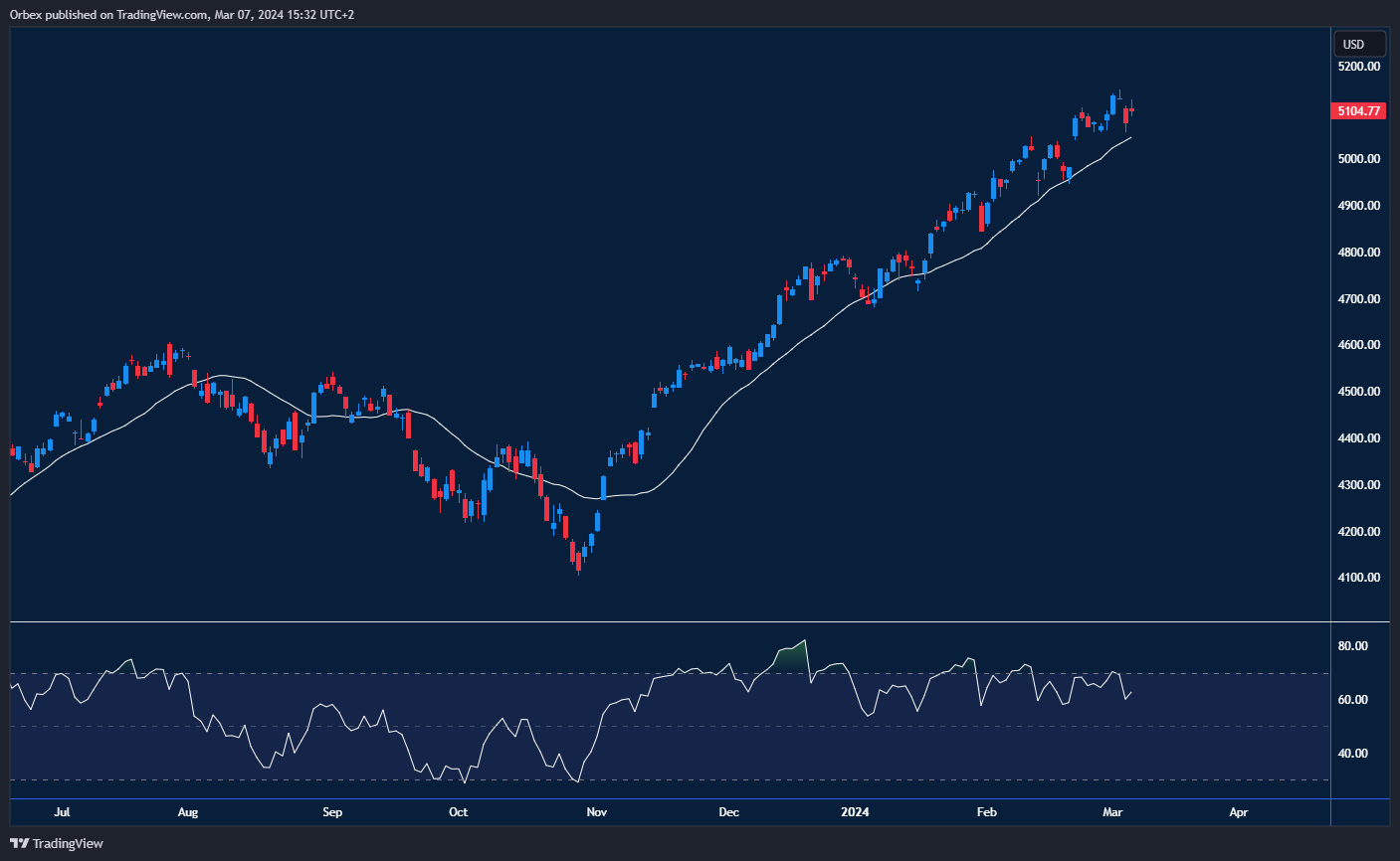 The S&P 500 took a breather from setting another record high as earnings season winds down. With Goldman Sachs and Bank of America raising their forecasts for 2024 for the index, the likelihood is that price action will push higher again. However, mixed nonfarm payroll numbers could pause sentiment, representing a significant downside risk for equities. The index steadily remained at around 5100, with a limit of 5350 in the near term.