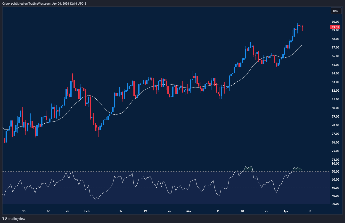 Brent crude settled at its highest levels in 5 months over concerns about supply disruptions due to the conflict in the Middle East. The worry over supply disruptions also continues. However, some of these concerns were lowered by an unexpected increase in US inventories. With the rally approaching the psychological level of $90, traders will wonder if another $10 jump will happen at the end of the quarter. 86.00 has become an effective floor as the price looks for resistance at 89.50.