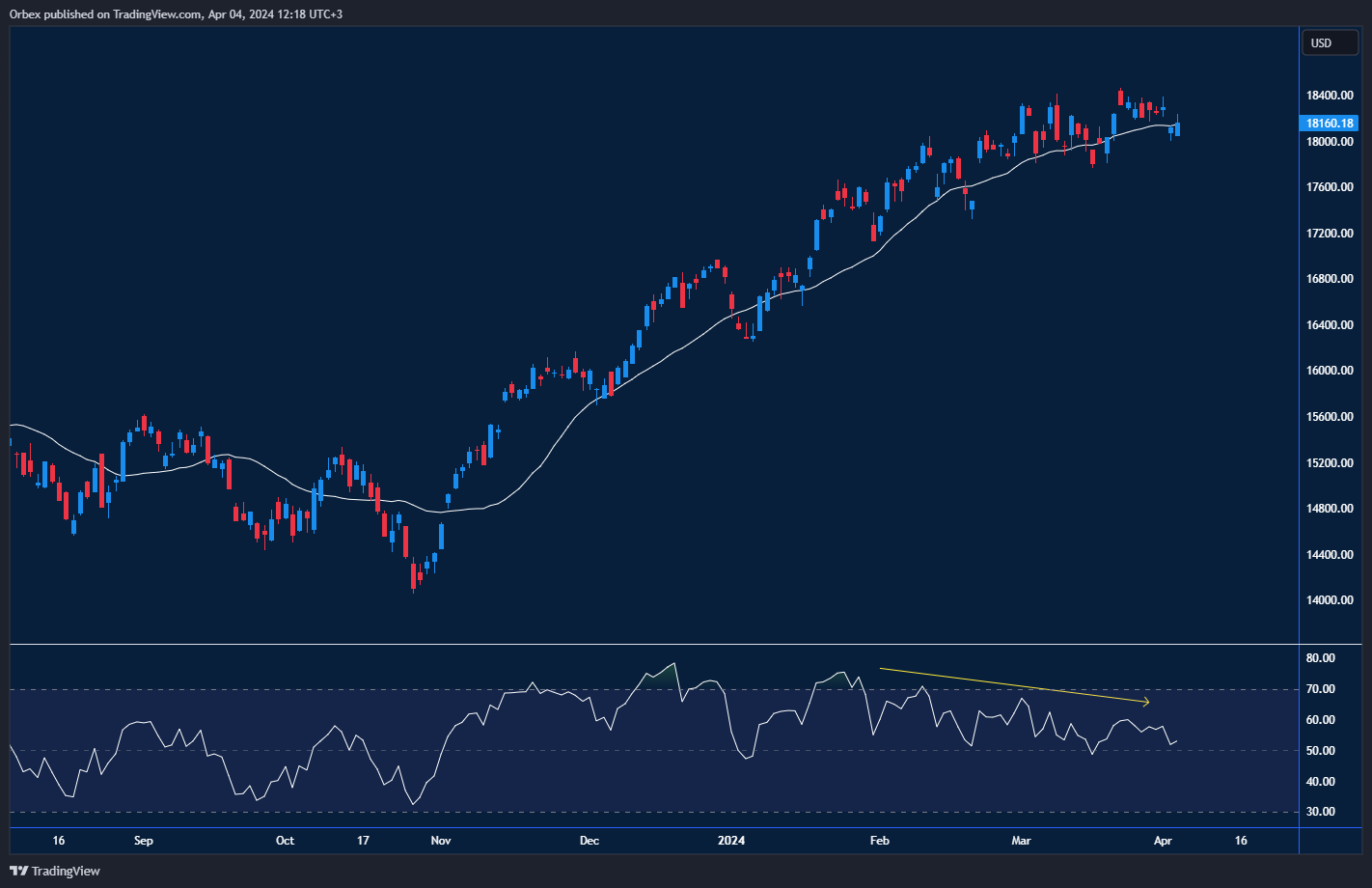 The Nasdaq 100 kept the rally going as another record high is in sight. The push was attributed to PMI data showing the manufacturing industry moved higher in March and a decent NFP report. A slight dip followed confirmation of the Fed’s recent dovish monetary policy outlook. But the Bulls hope this is just a slight retracement and not the beginning of a correction. 18500 is the next target, with 17600 as the support.