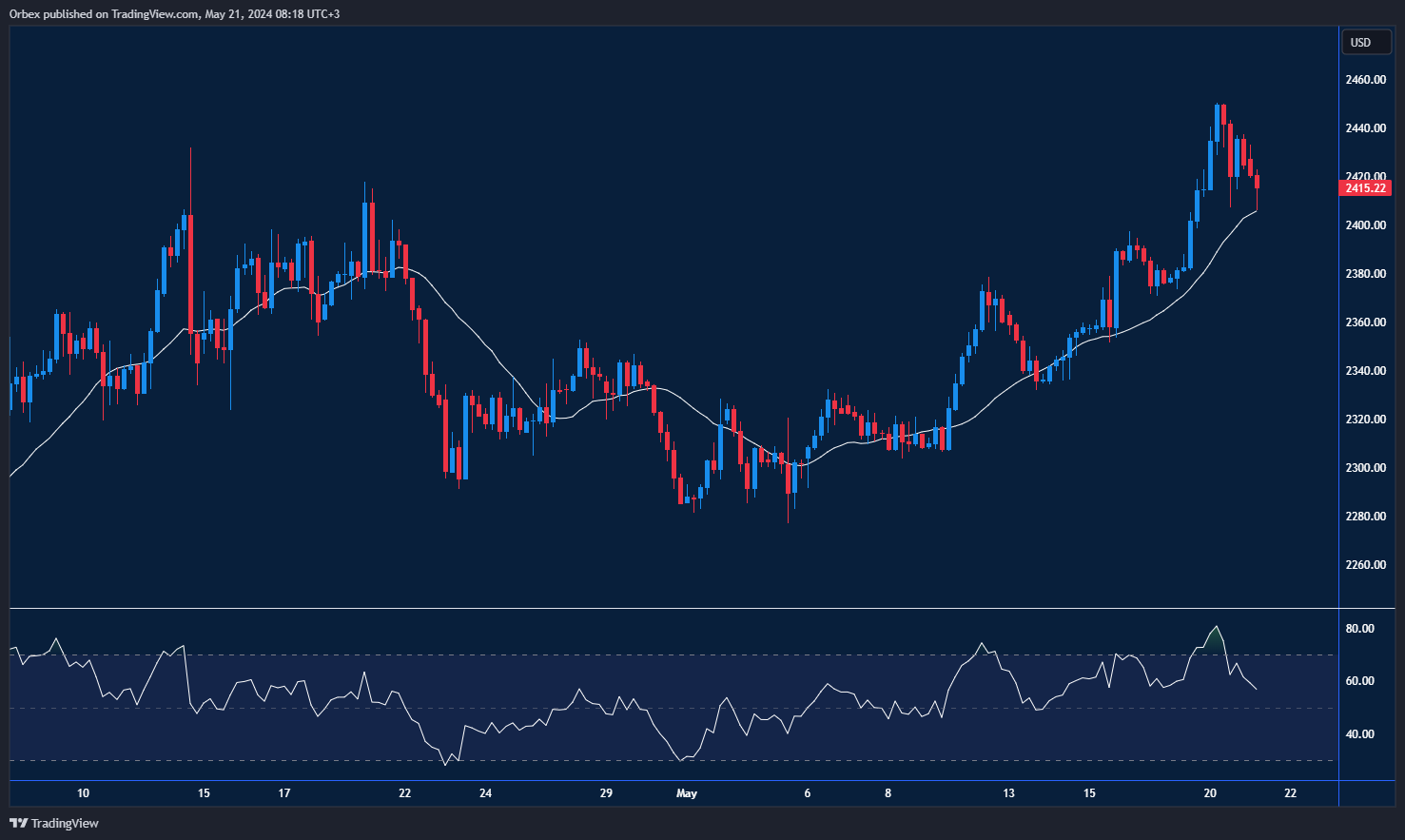 Gold falls from its recent record high as traders await numerous Fed speakers and meeting minutes. A fall below the daily support 2400 will dent the bullish mood, prompting buyers to trim their exposure in fear of a deeper pullback. A bearish RSI divergence combined with a faded rebound suggests another fresh high is out of the question. The gold price forecast indicates that a drop below 2375 would renew the selling pressure and make 2340 the next stop. To resume the rally, 2440 is the ceiling to lift.