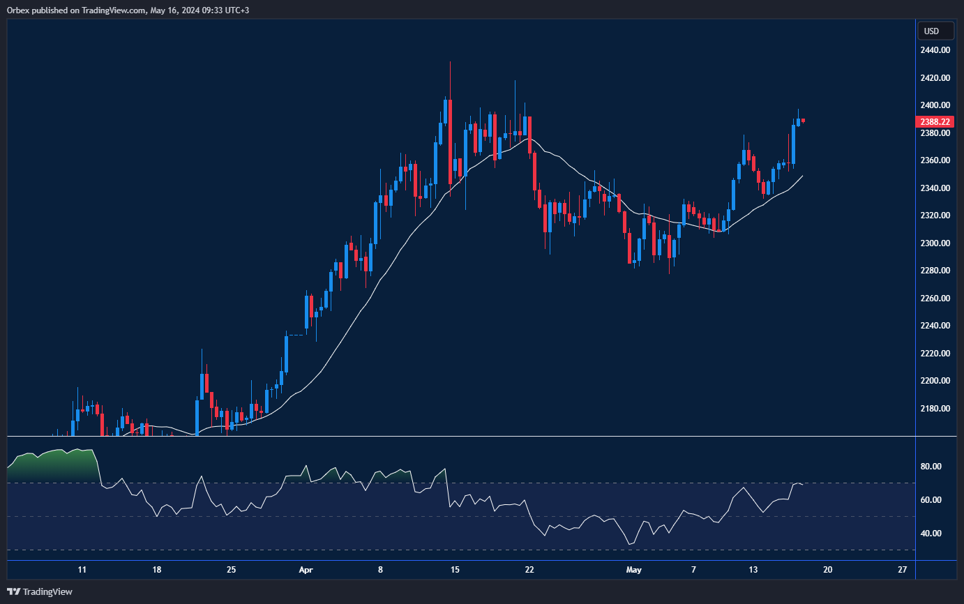 Gold jumped to the highest price over three weeks after sticky inflation and weak retail sales. This could reinforce expectations that the Fed will begin its rate cuts this year. With stagnated retail sales last month, indicating high borrowing costs and mounting debt, could weigh heavy on an already fragile economy. With geo-political tensions still simmering, the yellow metal could begin testing record highs soon. 2320 is the first support, and 2400 is a new peak.
