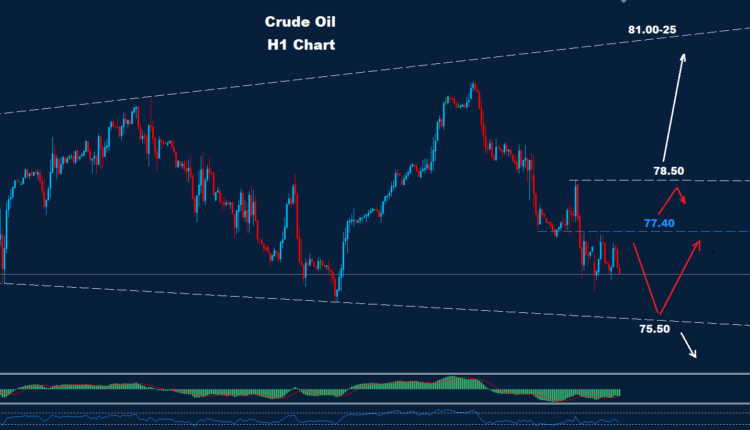 Crude Oil fell below 77.00, which could continue the current downtrend pressure.