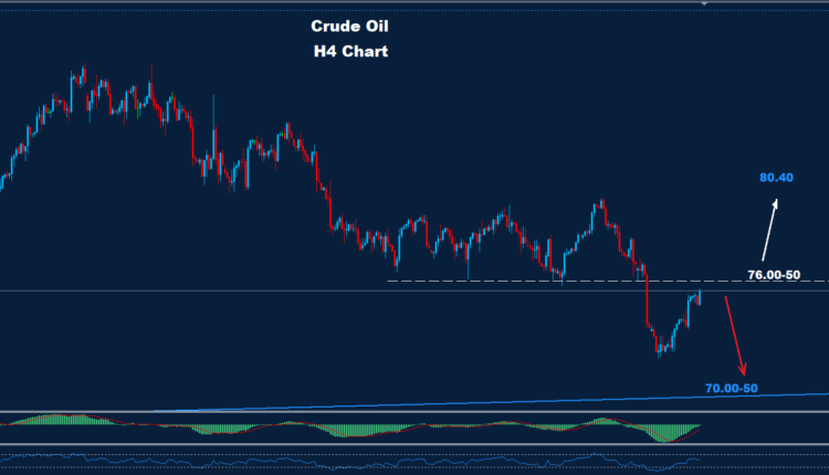 The market is closing in on the resistance zone at 76.00-50, where if prices hold below, a chance for another drop towards 70.00-50 could happen.