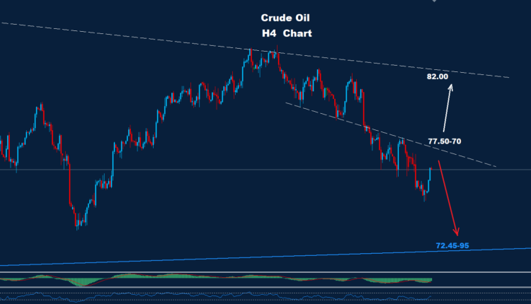 Crude Oil managed to fall below the 76.00 support which could keep the downtrend pressure on for a further drop.