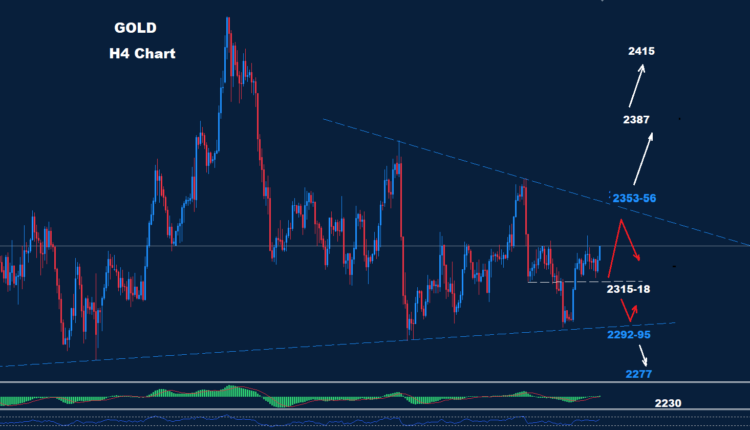 As seen on our previous chart, Gold is still holding in our expected trading zone between the support 2315-18 and resistance 2353-56.
