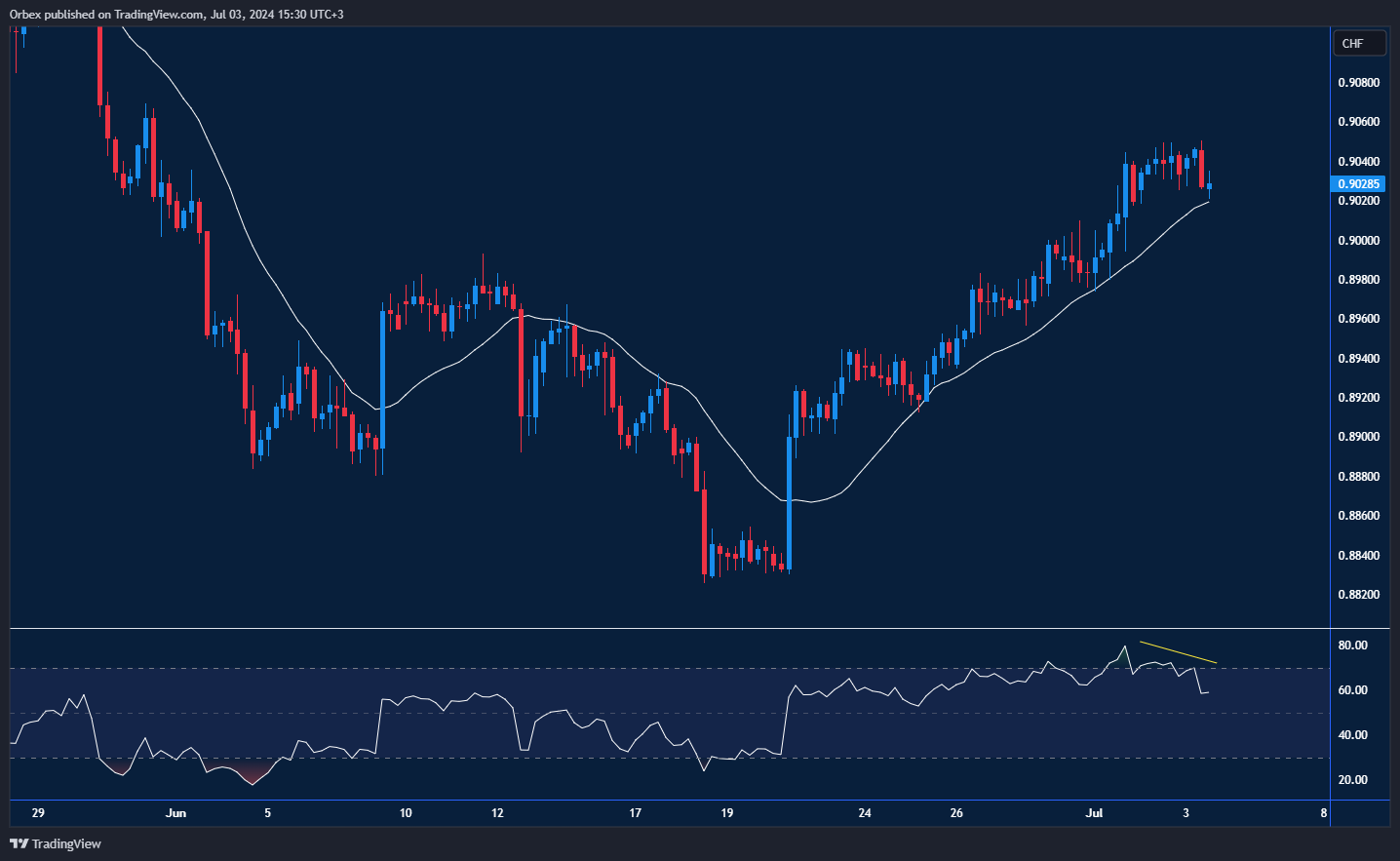 Cable found some support in the run-up to today’s General Election, highlighting the GBP election impact on the currency pair. The latest move has met bids after bouncing off the latest support at 1.2620. A bullish RSI divergence indicates a slowdown in the sell-off momentum and could attract more long-term interest. 1.2730 is the first hurdle, and its breach would make the pair retest the recent high of 1.2850. Otherwise, a fall below 1.2600 would trigger a new round of sell-off below 1.2500.