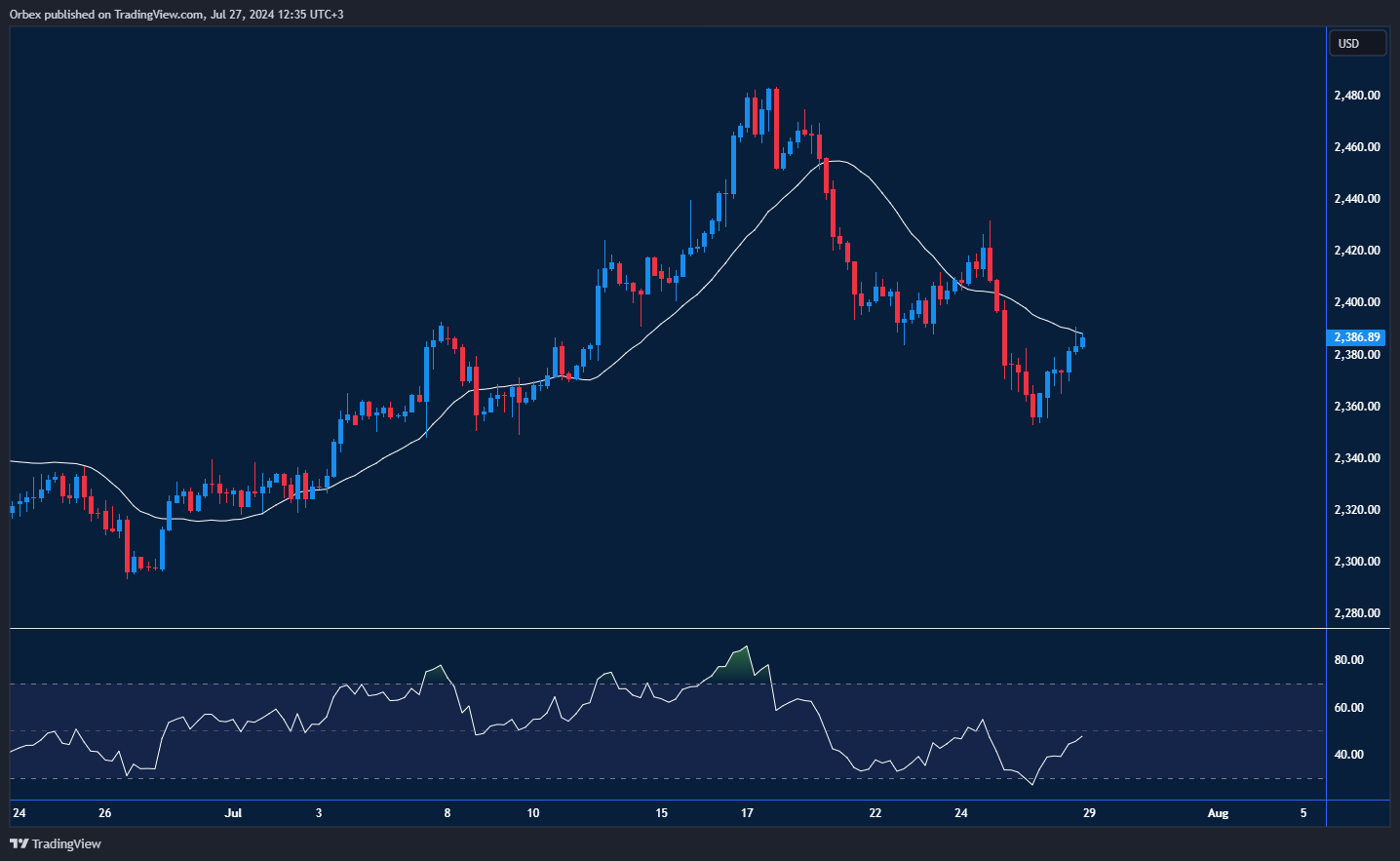 Gold slide after upbeat GDP data came in higher than expected. However, the price seems to have secured a foothold around the psychological level of 2400, and a series of higher lows combined with a tentative break above 2360 suggest further buying pressure. However, the yellow metal needs a decisive close above 2425 at the last swing high to flush out the remaining selling interests and extend the rebound to 2460. On the downside, 2325 is the immediate support to keep momentum intact.