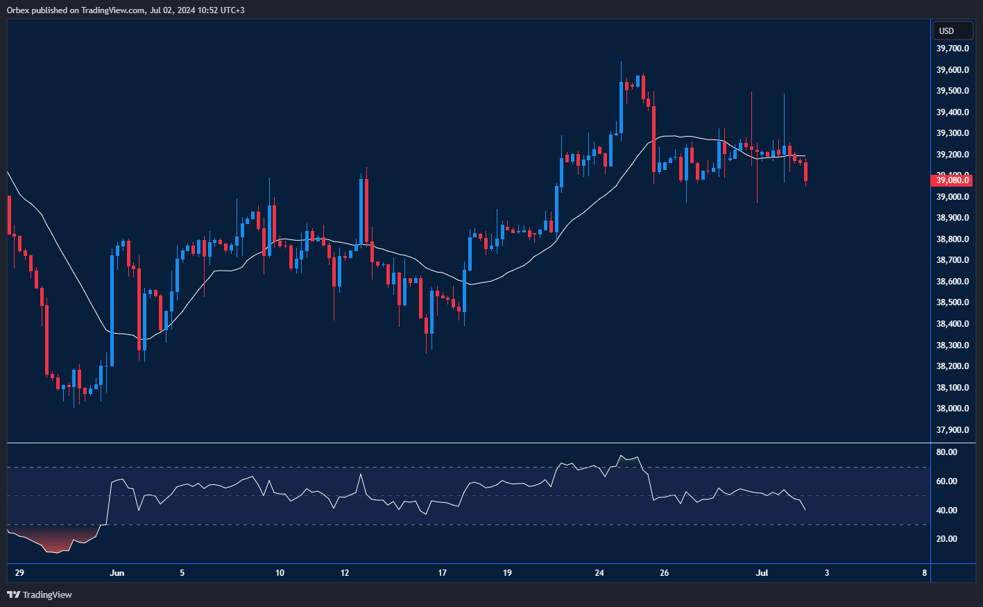 The Dow Jones saw two false spikes put a dent in another move to the 40,000 level. After a brief sideways pattern, traders are now looking for the following signals from the Fed and NFP this week. A bullish breakout could pave the way for an extension to another record high. 39800 is the closest support as the RSI ventures into the neutral area, and buyers could see a limited pullback as an opportunity to move in.