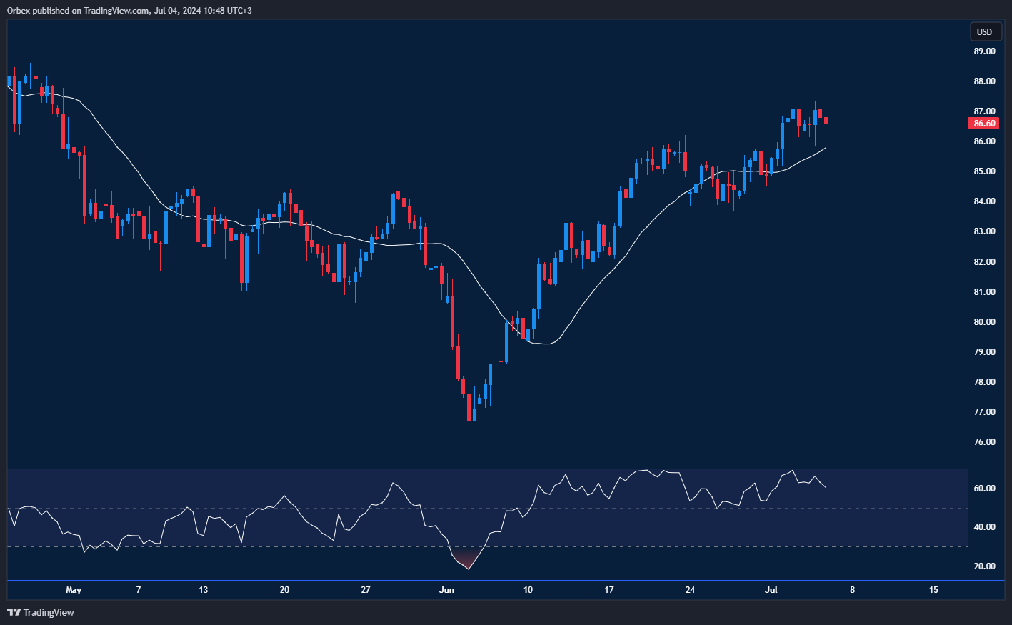 Brent extended gains to two-month highs due to the expected rising demand during the summer and possible supply disruptions from the hurricane season. Also supporting oil prices are the ongoing geopolitical risks linked to Middle East tensions and signs of subsiding inflation. With the Euro bloc cutting rates last month, it is only a matter of time before the Bank of England does the same. The price hangs just below the 88.00 resistance, with 85.00 being the first support.