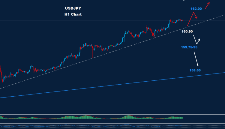 From last week, the USDJPY pair managed to break above the 160.00-20 resistance zone which kept the uptrend wave going. So far prices have reached a 161.92 high closing on the target 162.00.