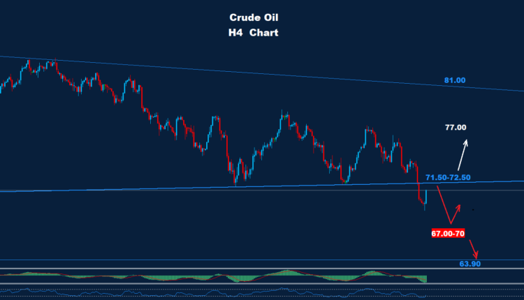 Crude Oil broke below 71.15 two days ago and dropped toward the target of 68.80.