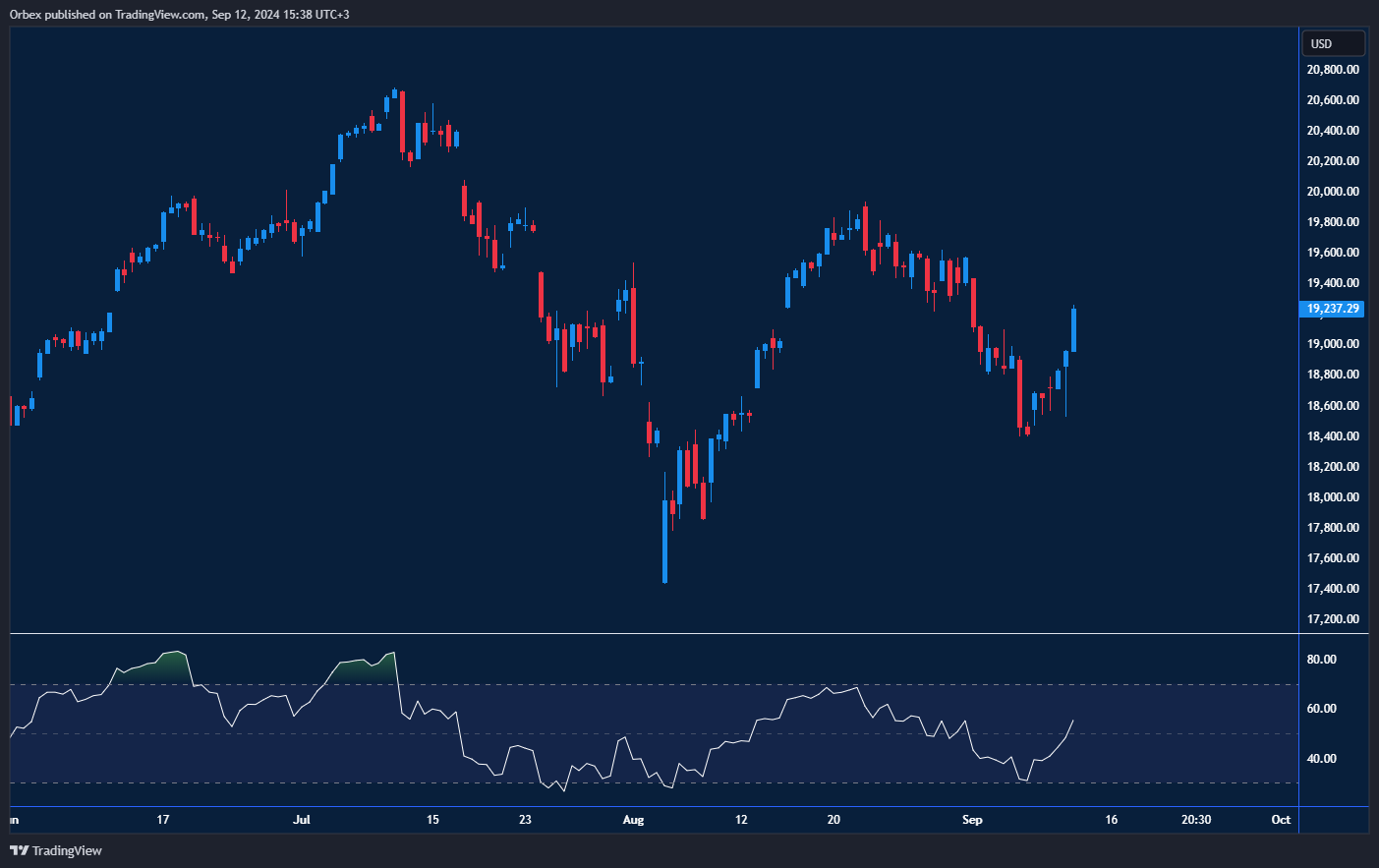 The Nasdaq soared as Nvidia shares spiked over 8%, leading the way for tech stocks. On the chart, the break above 19000 suggests that the index might be on course for another record. A pop above the tip of a previous swing high at 19400 will prompt more sellers to cover, clearing the path for a potential recovery past 20000. As the RSI bounces off oversold territory, 18750 is a fresh level to contain the pullback.